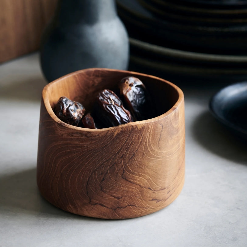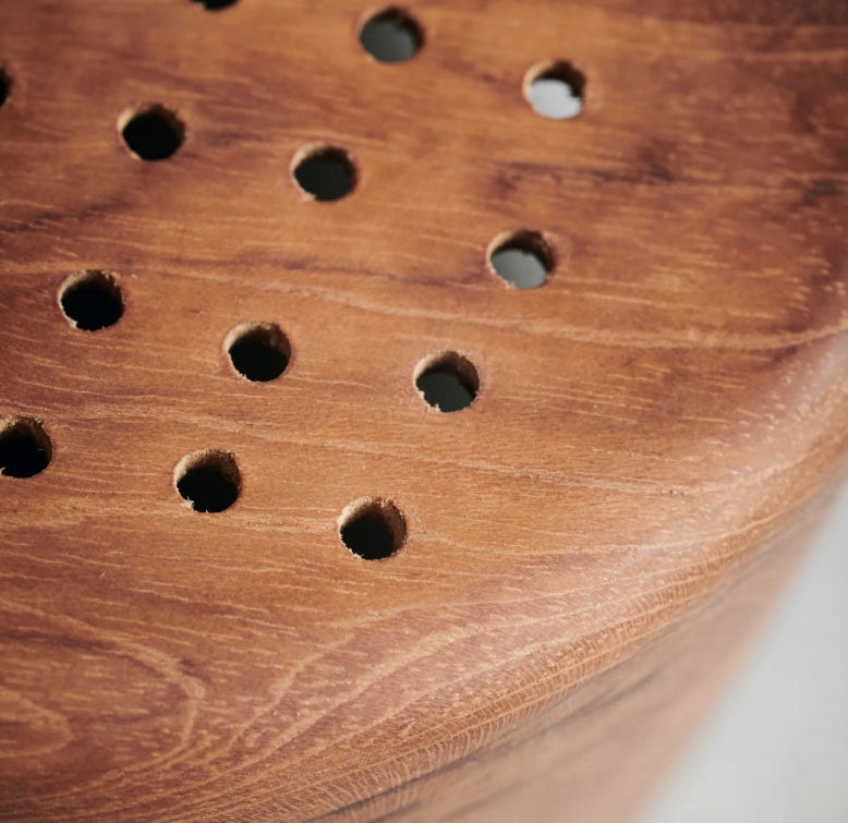 Takket være hullene i bunnen kan skålen brukes som sil eller til oppbevaring av løk, hvitløk og andre tørrfôrvarer som krever noe sirkulasjon. Plasser skålen på kjøkkenbenken og la teaktreet være aksentmaterialet i innredningen din.
