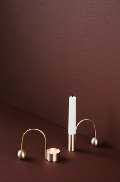 De geometriske formene er både skulpturelle og funksjonelle elementer, da buen kan brukes som et håndtak for å bære lysestaken.