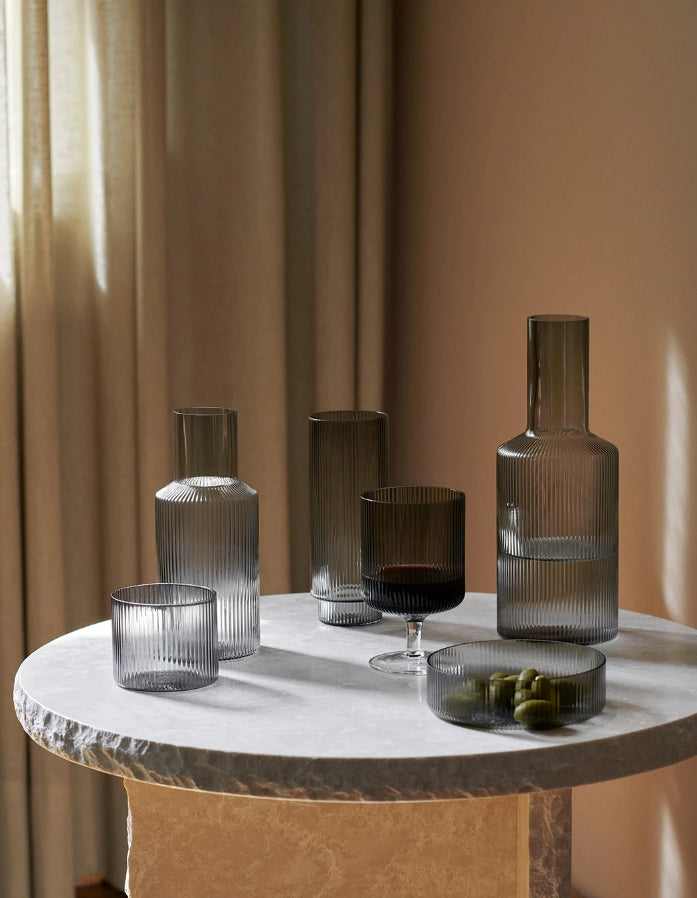 Ripple skåler i 4-pakning fra danske Ferm Living er et sett med fire munnblåste skåler. Skålene inngår i den elegante Ripple-serien, som kjennetegnes av den rillede teksturen, rette linjer og sofistikerte uttrykk.