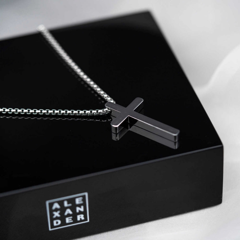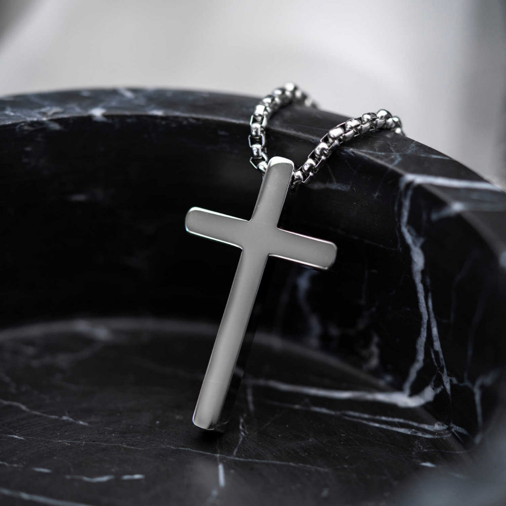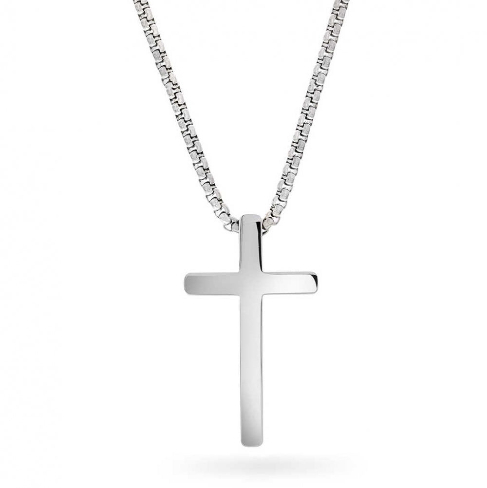 Enkelt stål kors til herre, høyde 43 mm og bredde 25 mm. Leveres med stålkjede, lengde 55 cm. Finnes også i gullforgylt.