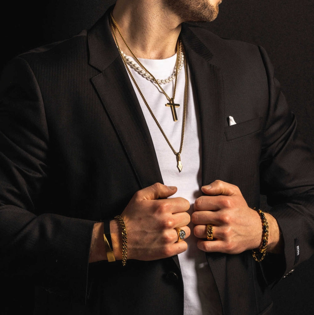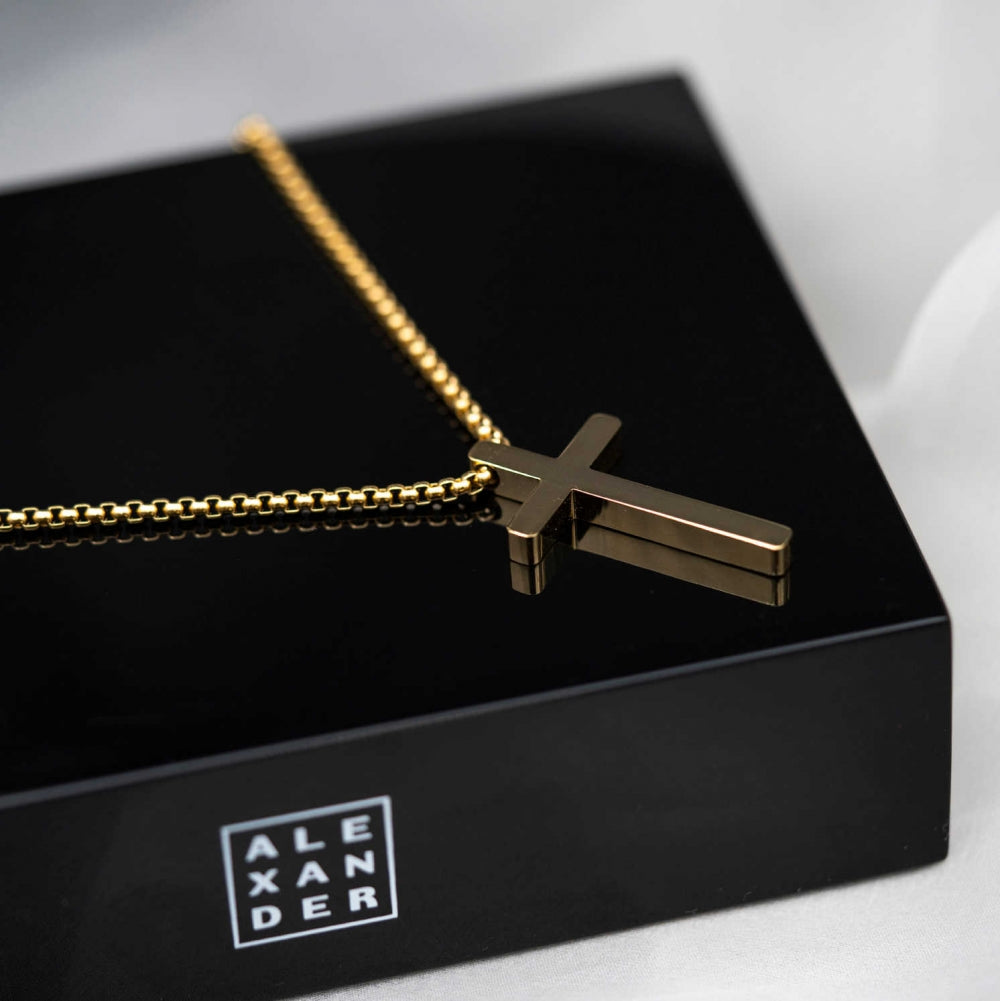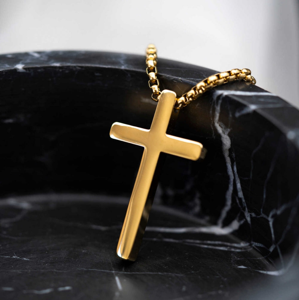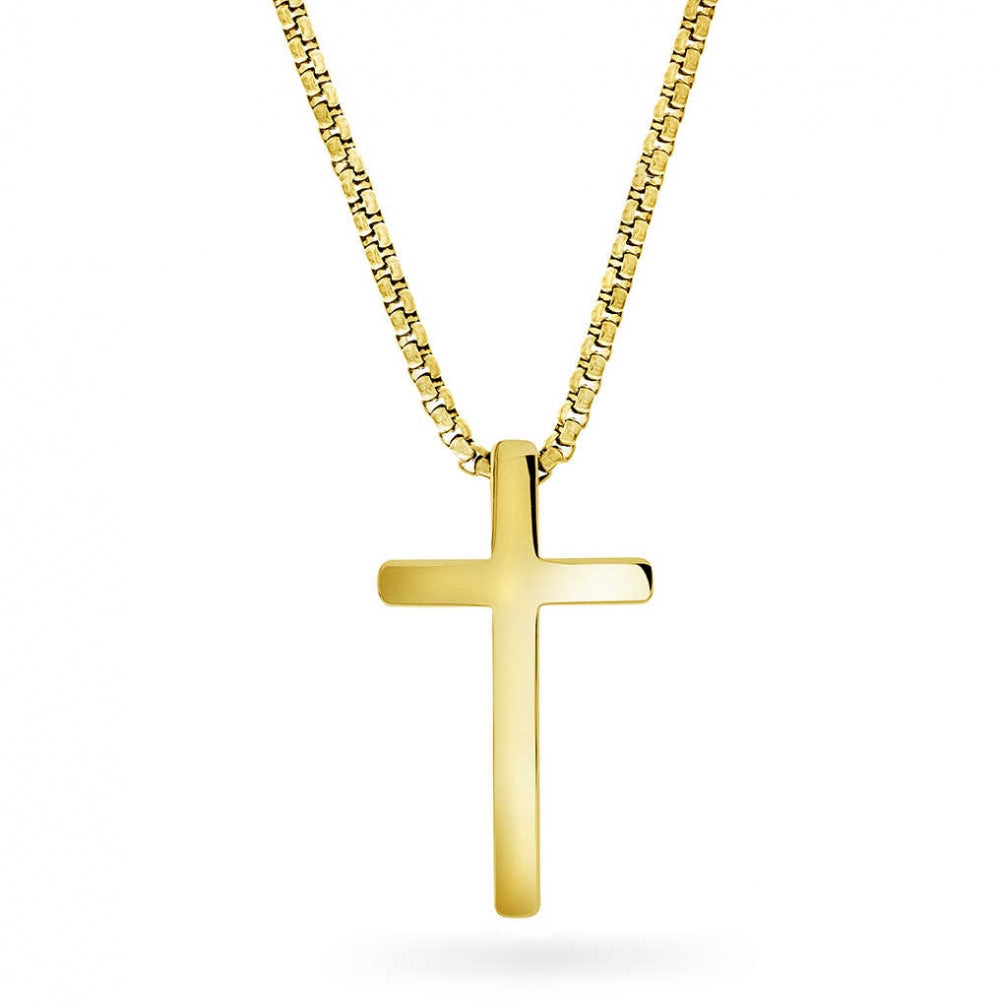 Enkelt stål kors til herre, høyde 43 mm og bredde 25 mm. Leveres med stålkjede, lengde 55 cm. Finnes også i sølvfarget stål.