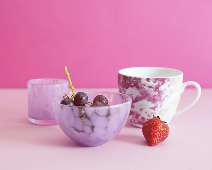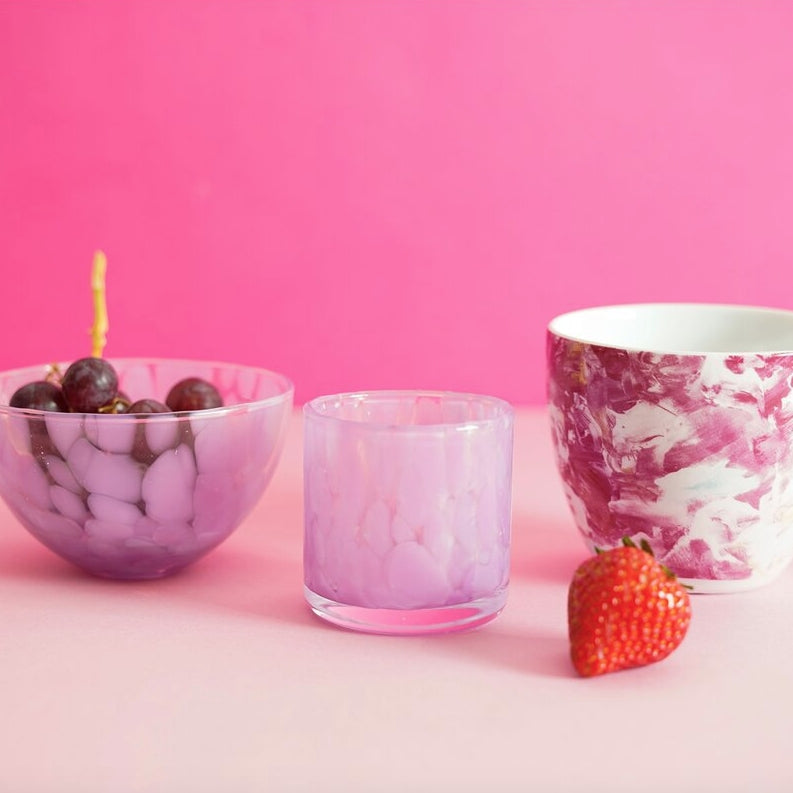 Dette kunstglassproduktet er gjennomskinnelig med rosa smeltede glassbiter, som gjør den enkel å kombinere med andre farger. Telykten skaper en magisk atmosfære når den lyser innenfra.