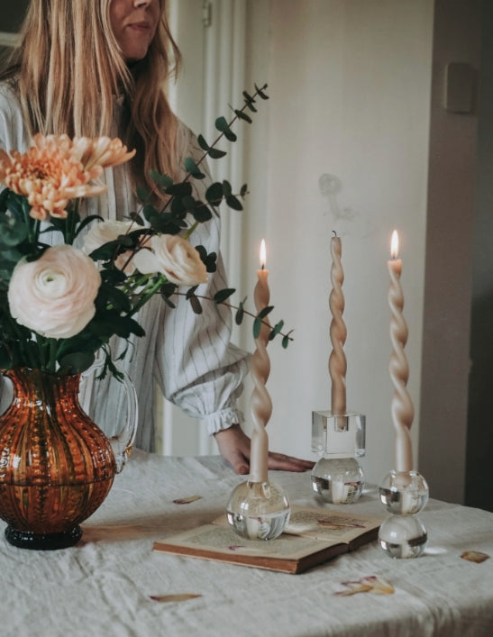 Merk! Crystal Color Crush-serien er laget av massivt krystallglass. Vær derfor forsiktig så du ikke plasserer lysestaken i direkte sollys eller hvor solstrålene kan treffe den, da krystallet kan fungere som et forstørrelsesglass. Vær forsiktig så du ikke brenner lyset ned til krystalldelen. Rengjør lysestaken forsiktig med en tørr klut.