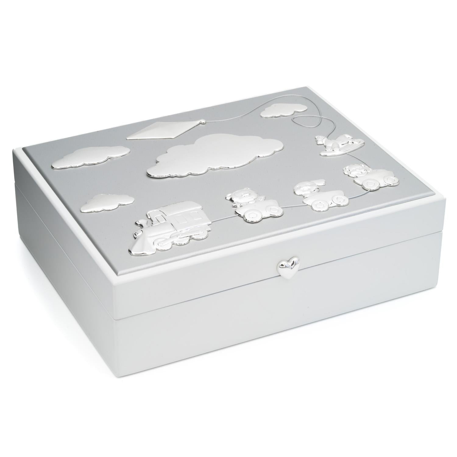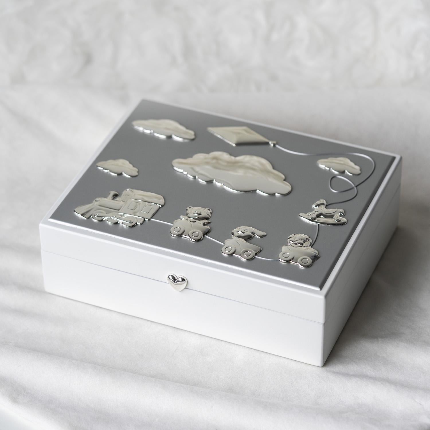 «Mitt første skrin» til de minste barna i hvitmalt tre. Skrinet er dekorert med elementer i forsølvet overflate. Passer som gave til dåp og navnefest.