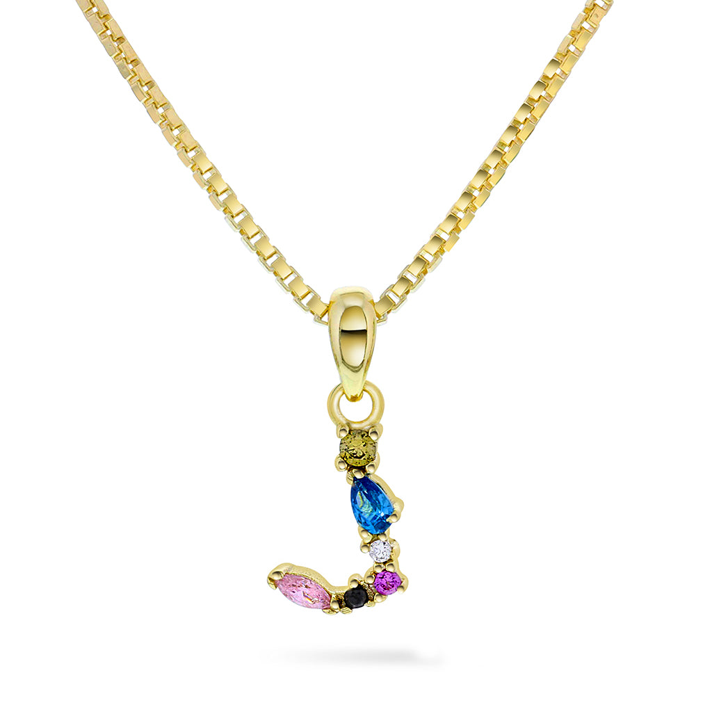 Bokstavsmykke J i forgylt sølv, flerfarget zirkonia