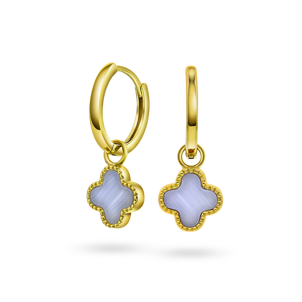 Trendy øreringer i forgylt sølv med klassisk kløver og lyseblå sodalitt fra Pan Jewelry Trend. Finnes også tilhørende armbånd, ring og smykke, samt i flere farger. H: 25 mm B: 15 mm.