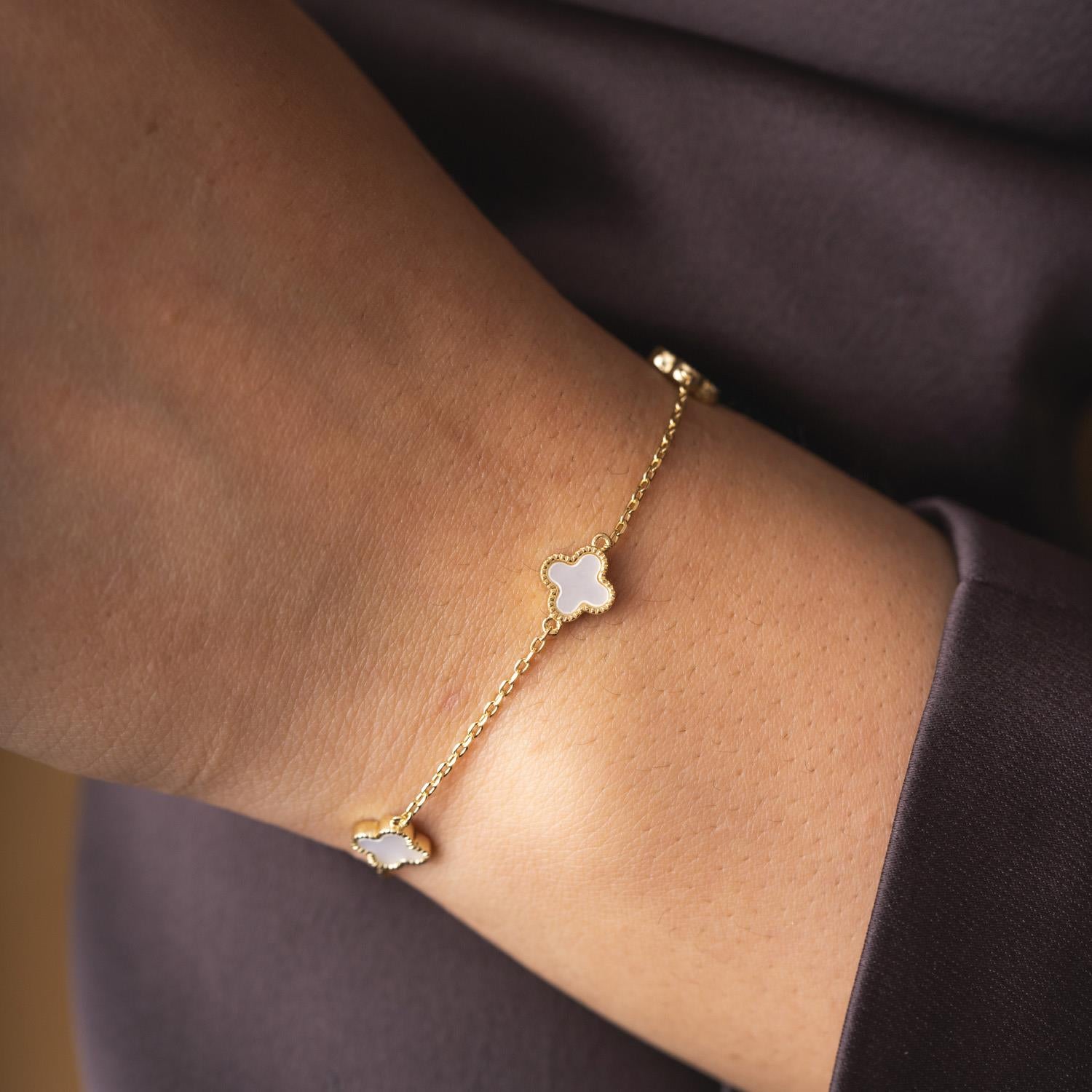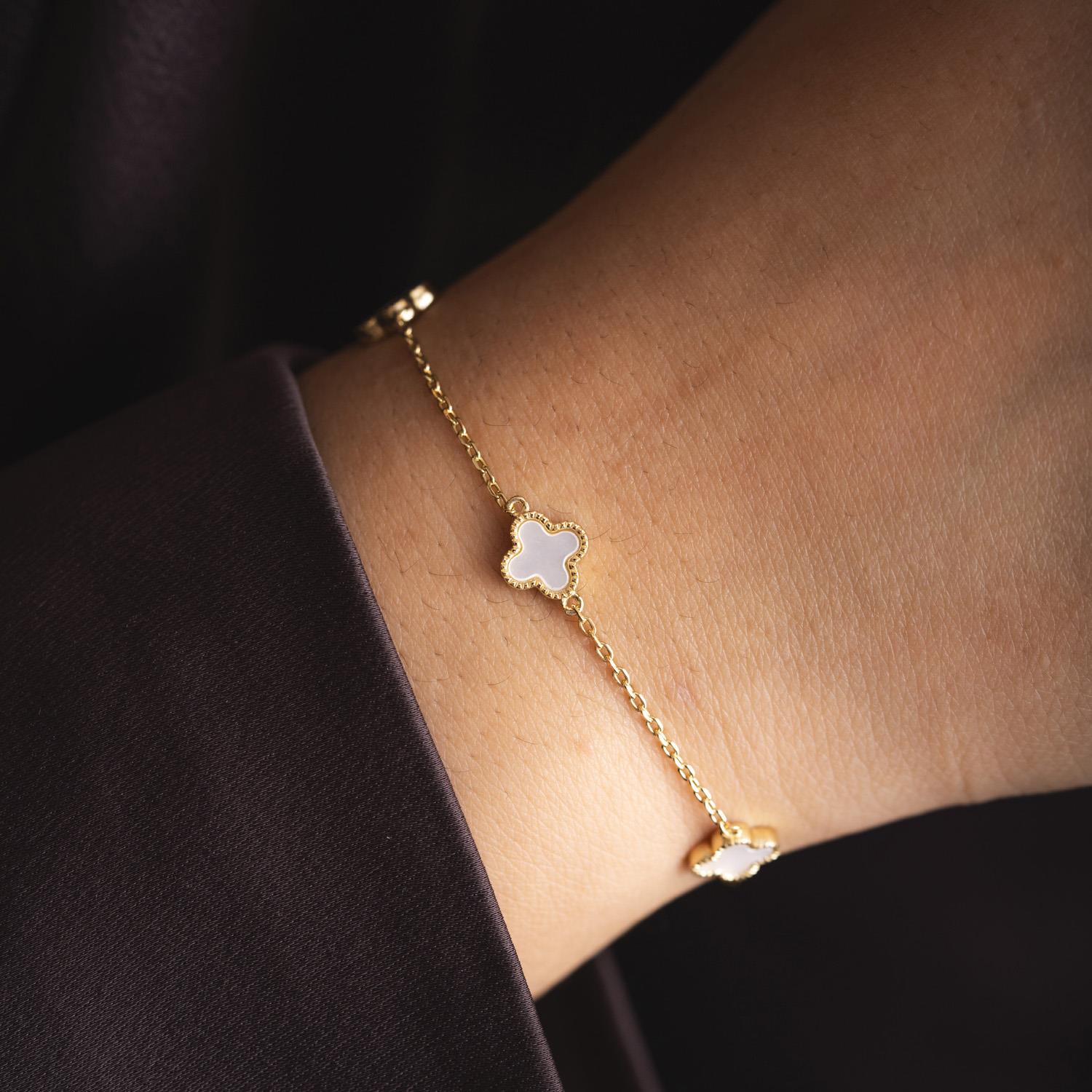 Trendy armbånd i forgylt sølv med klassisk kløver og hvit perlemor fra Pan Jewelry Trend. Finnes også tilhørende smykke, ring og øredobber, samt i flere farger. H: 8 mm, B: 8 mm, L: 16+3 cm.