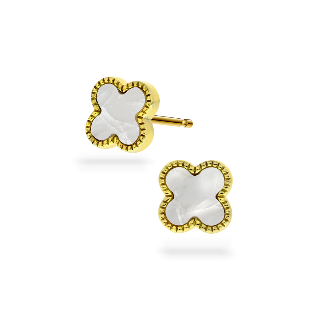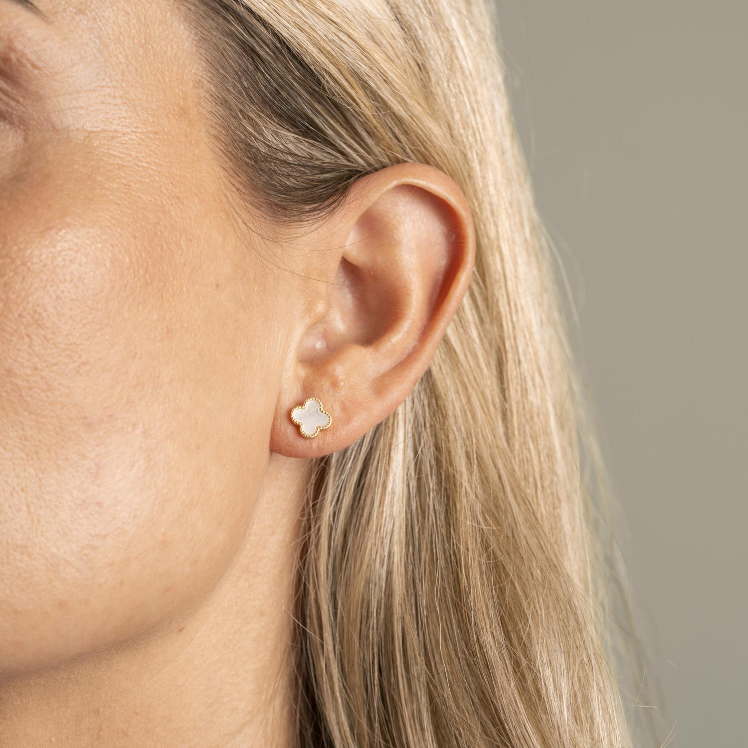 Trendy øredobber i forgylt sølv med klassisk kløver og hvit perlemor fra Pan Jewelry Trend. Finnes også tilhørende armbånd, smykke og ring samt i flere farger. H: 8 mm B: 8 mm.
