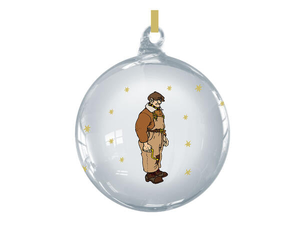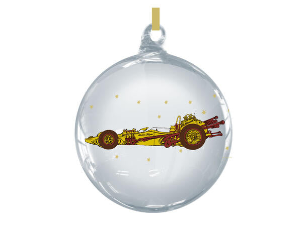 Flåklypa julekule med motiv av Reodor og bilen. Dekorasjonskulen i glass med satengbånd er laget av mummblåst blyfritt glass. Julekulen er stilren som passer på årets juletre eller andre steder i hjemmet!