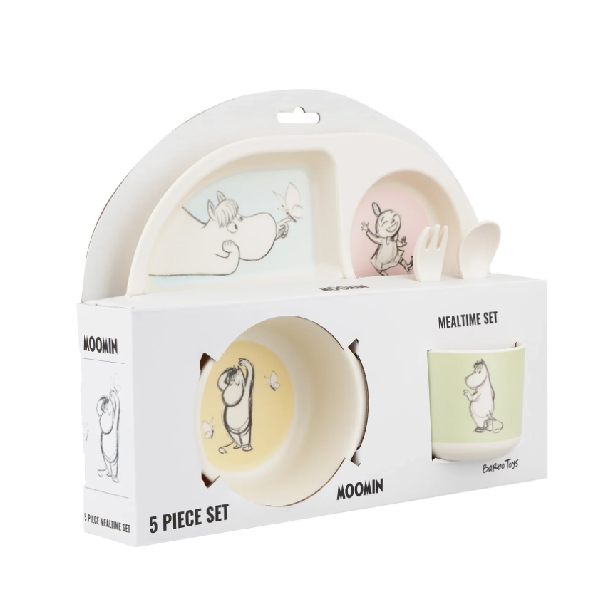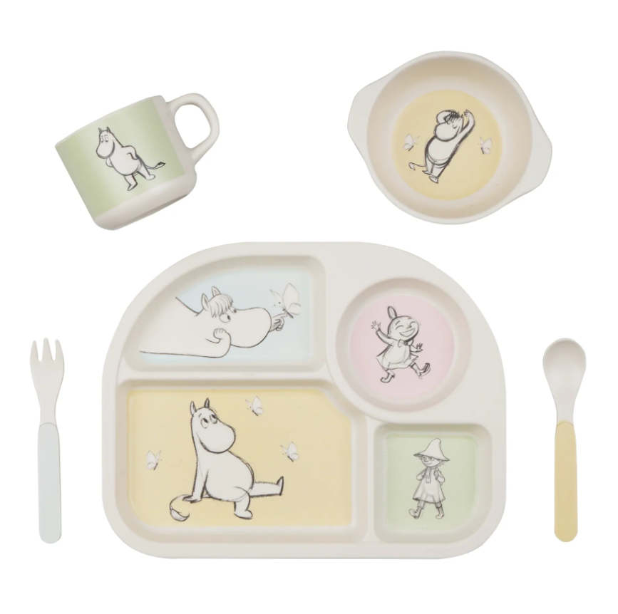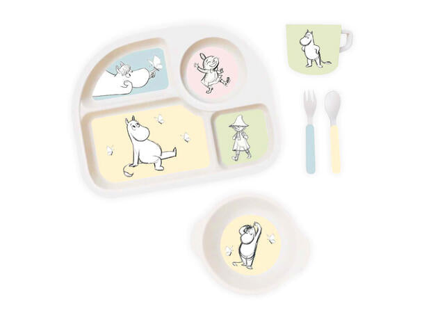 Dette vakre serviset med motiver fra Mummitrollets univers vil gjøre ethvert måltid litt morsommere for barna. Dette serviset gir en perfekt start når den lille skal begynne å spise selv. Innholder tallerken med 4 rom, bolle, kopp og 2 skjeer. Kan vaskes i oppvaskmaskin. Ikke til bruk i mikrobølgeovn.