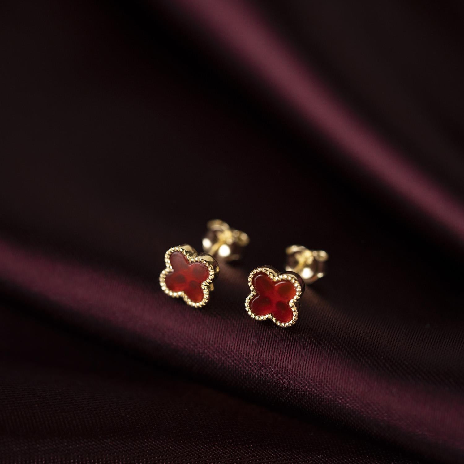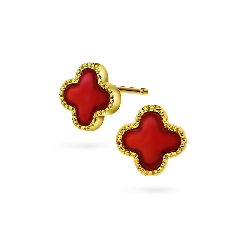 Lekre øredobber i forgylt sølv med kløver av rød agat. Kommer med tilhørende smykke og armbånd, samt i flere farger.