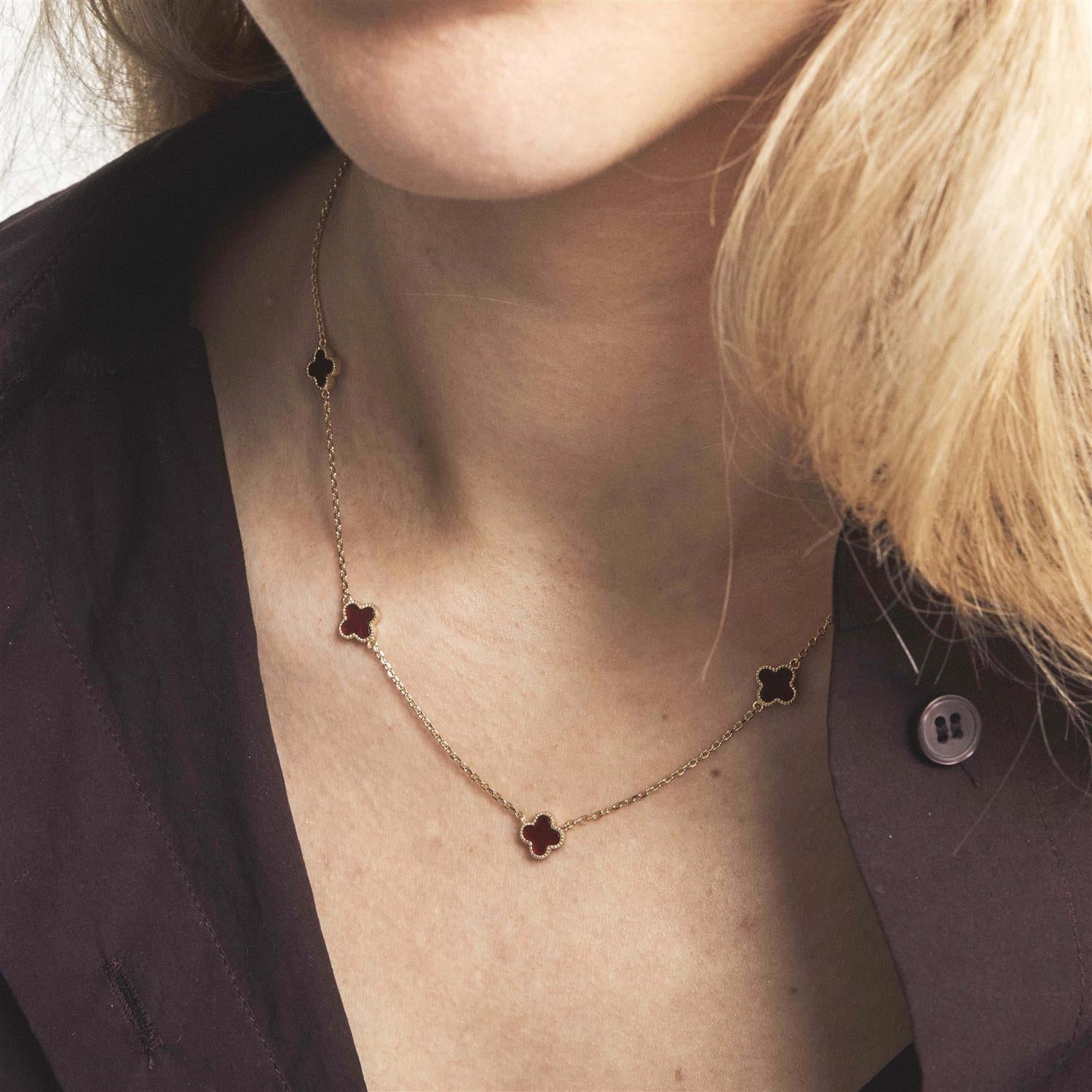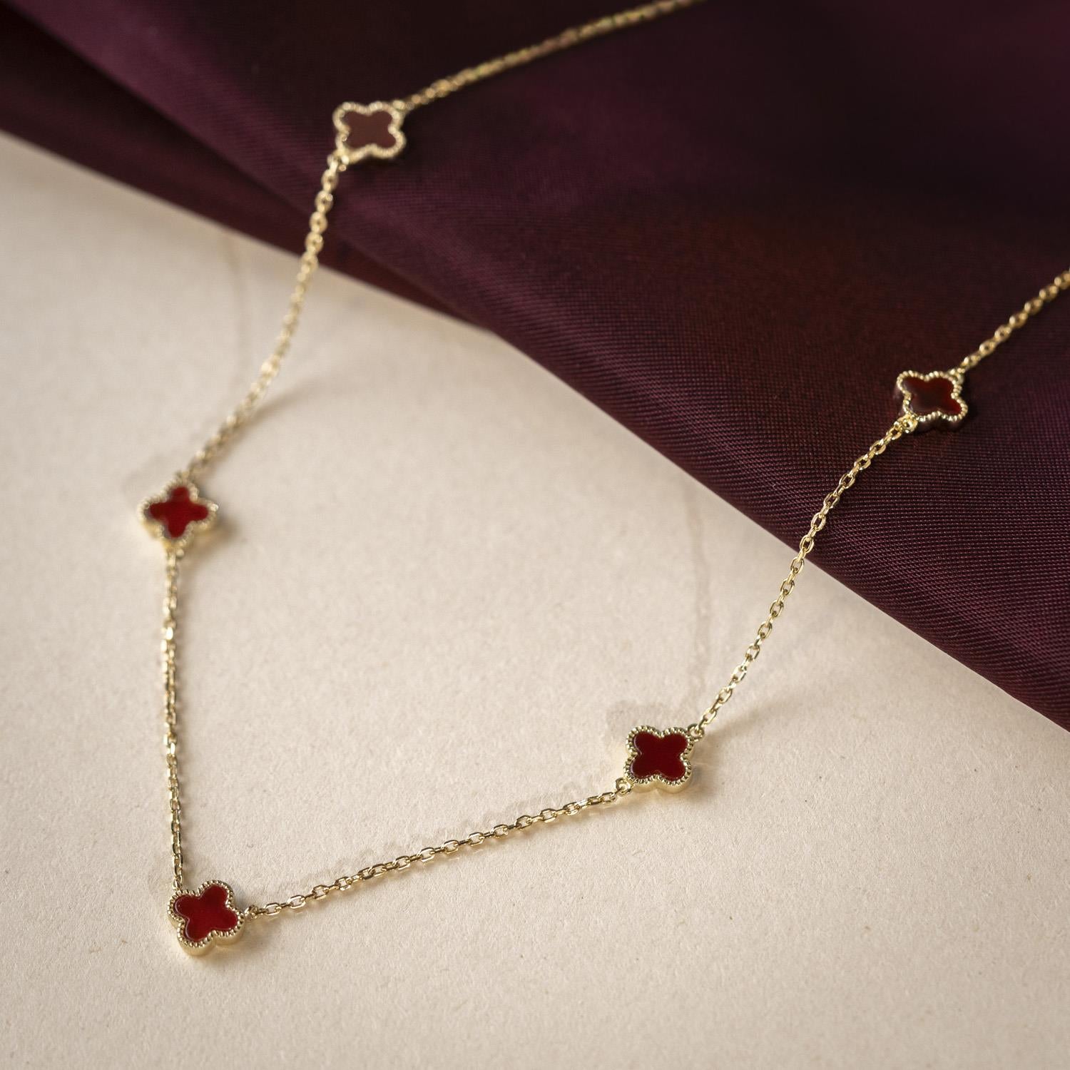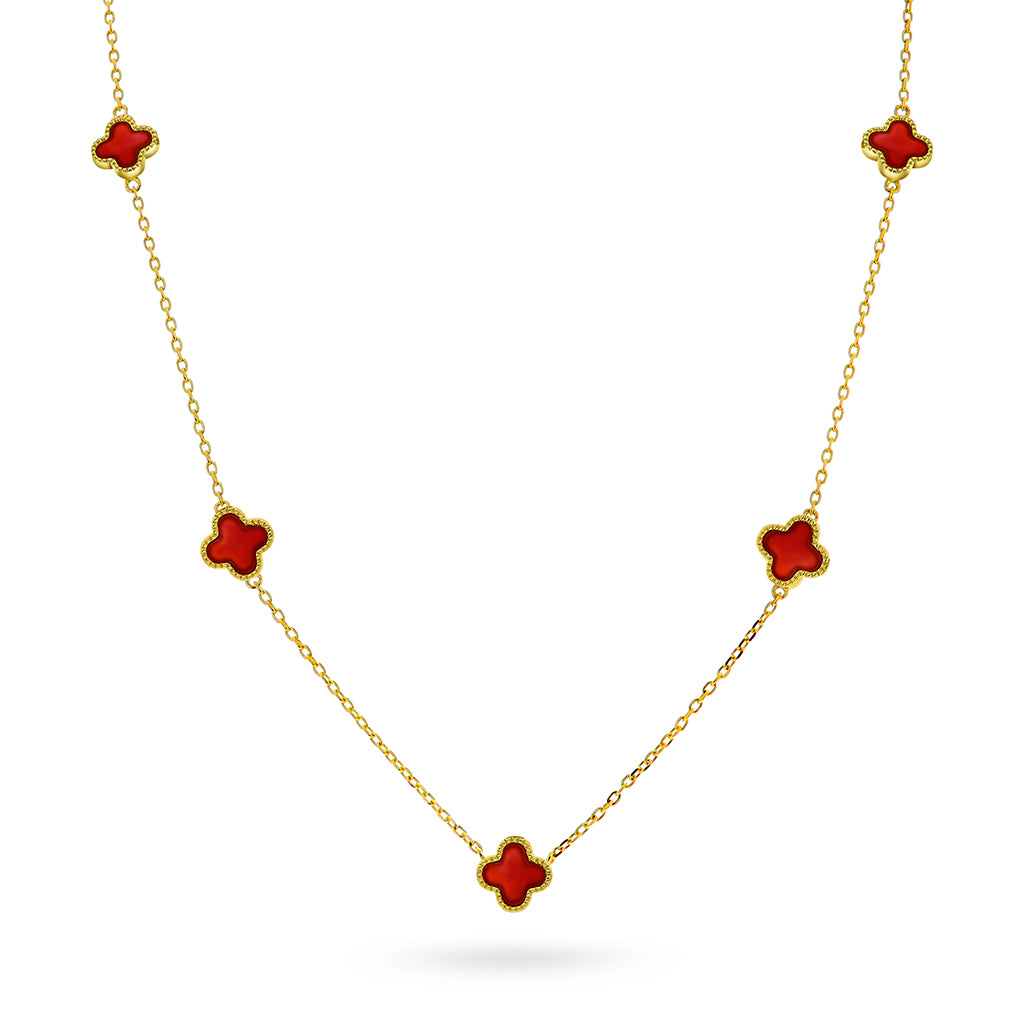 Lekkert halskjede i forgylt sølv med kløver av rød agat. Kommer med tilhørende øredobber og armbånd, samt i flere farger.