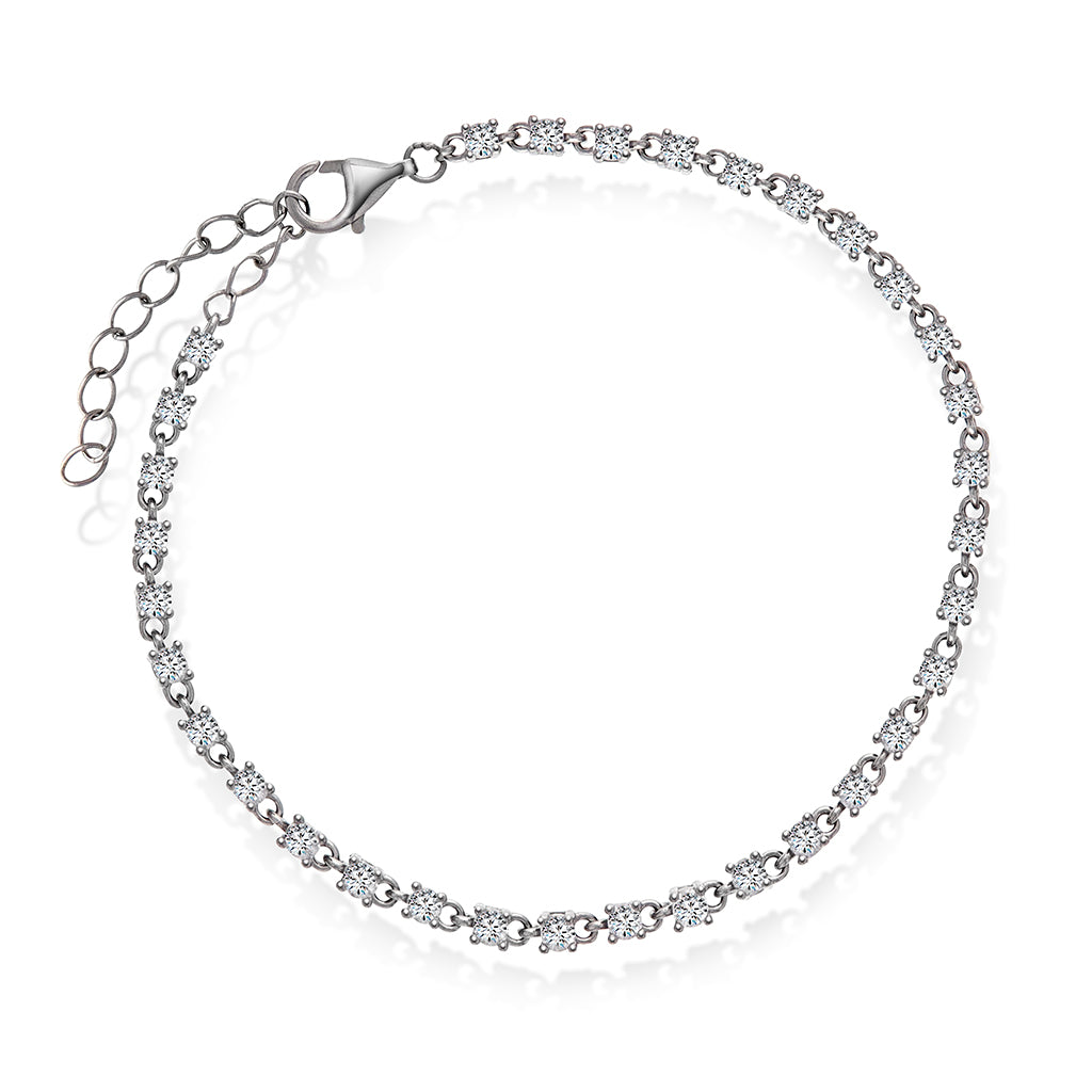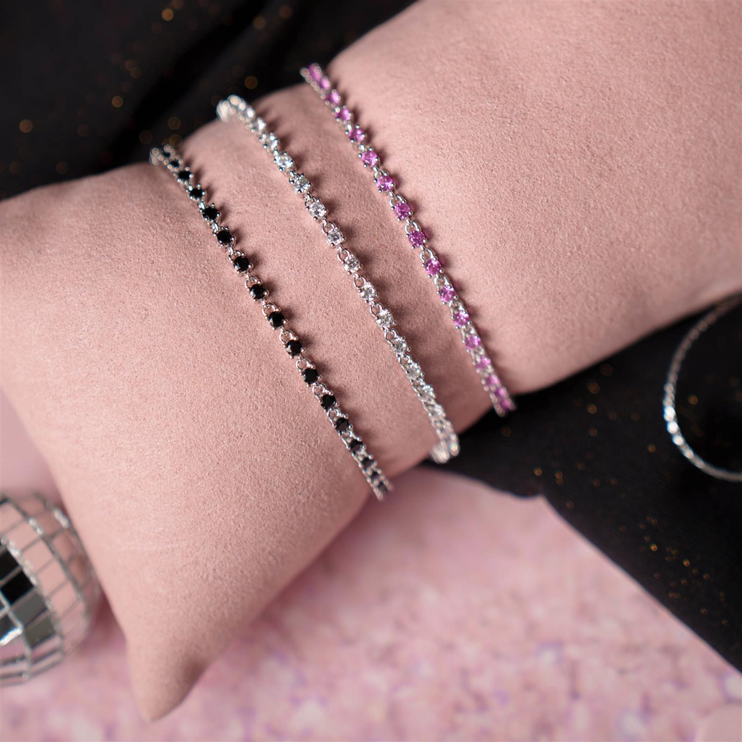 Elegant tennisarmbånd i rhodinert sølv, dekorert med hvit zirkonia. En delikat vri på en klassisk favoritt - sofistikert, stilrent og alltid like aktuelt. Fås også i øredobber, og i forgylt sølv. Samt i flere farger.
