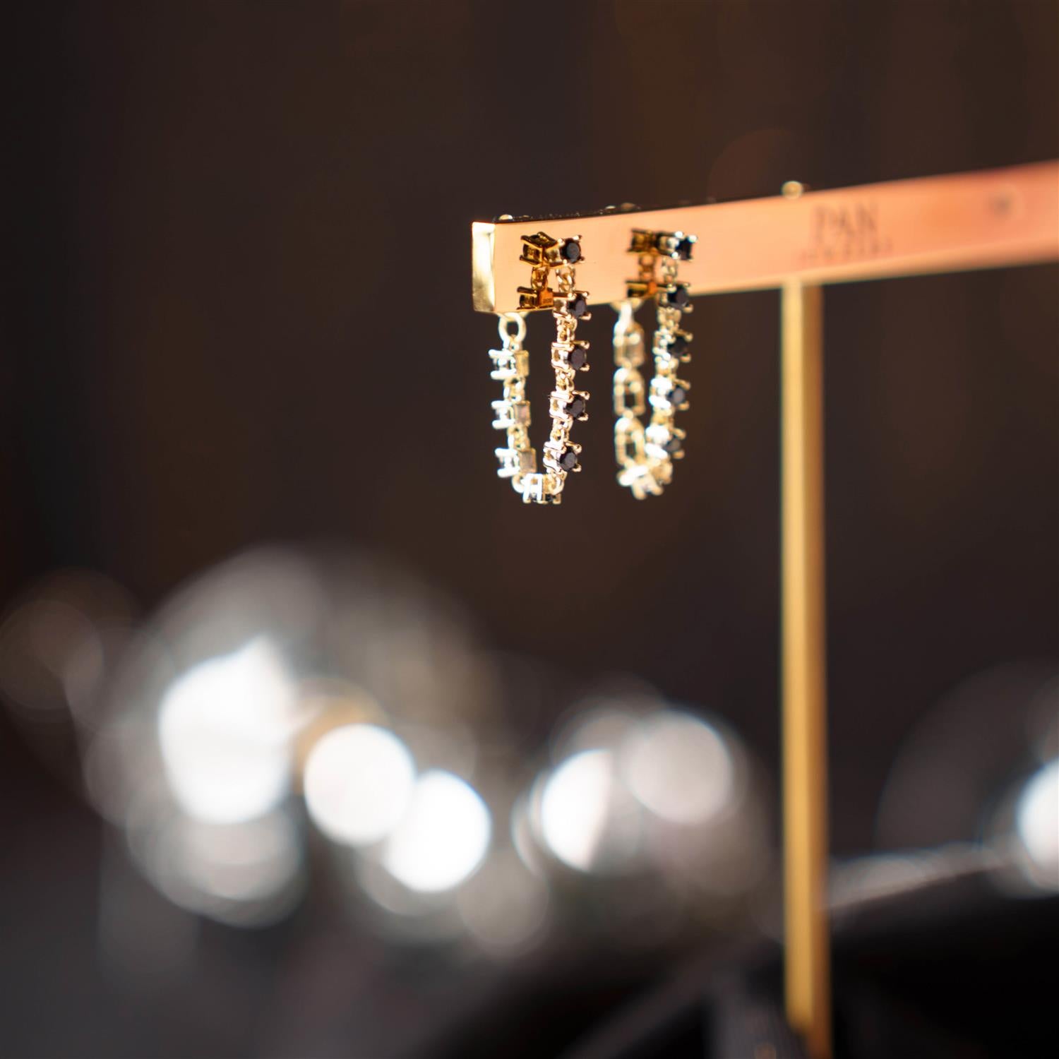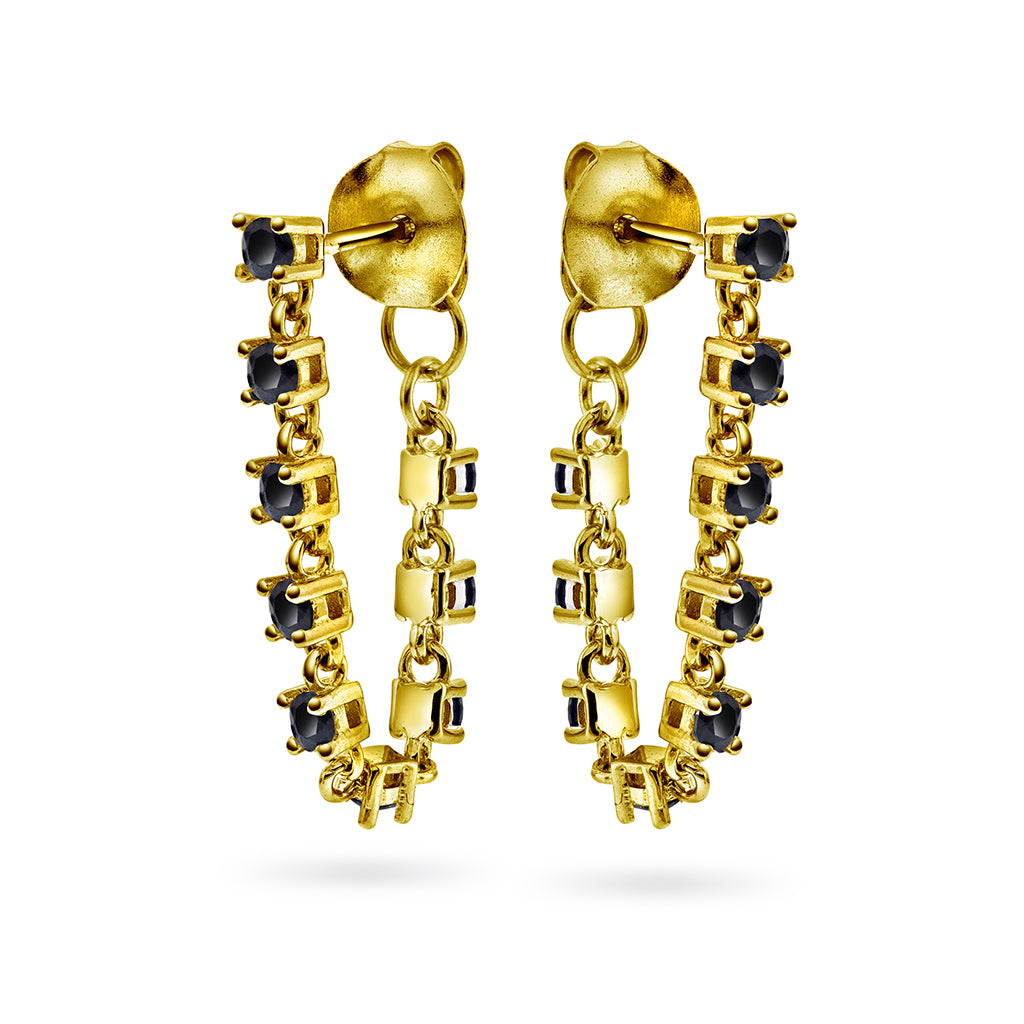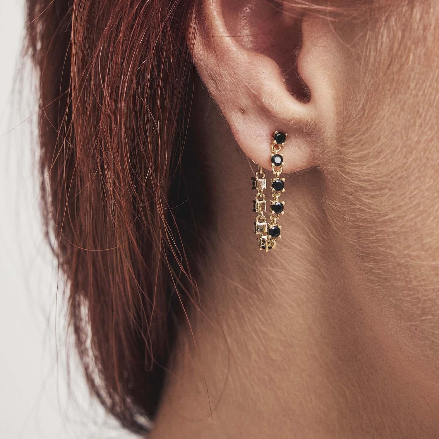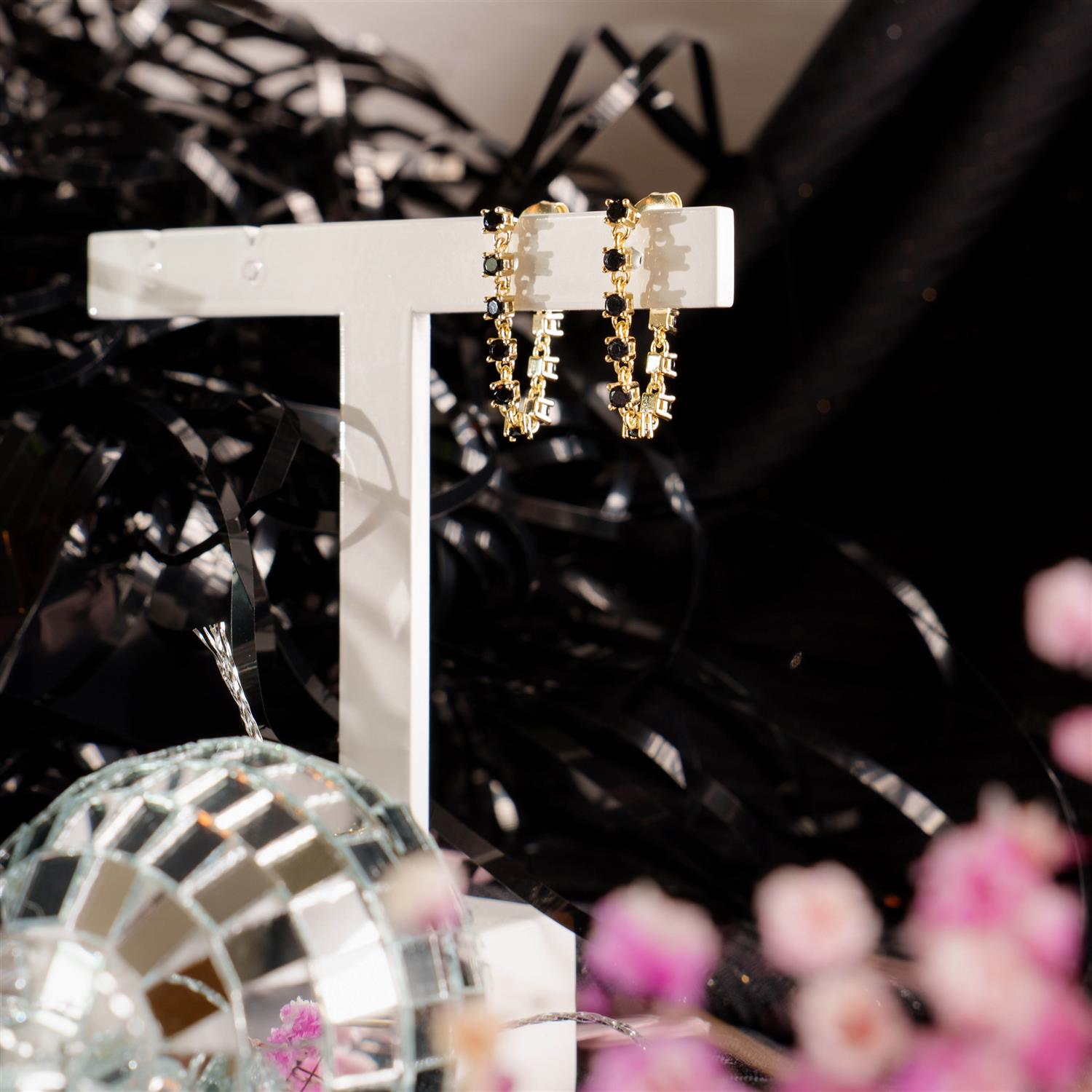 Trendy øredobber i forgylt sølv, inspirert av det klassiske tennisarmbåndet. Med svart zirkonia for et sofistikert og moderne uttrykk - perfekt til både hverdag og fest.