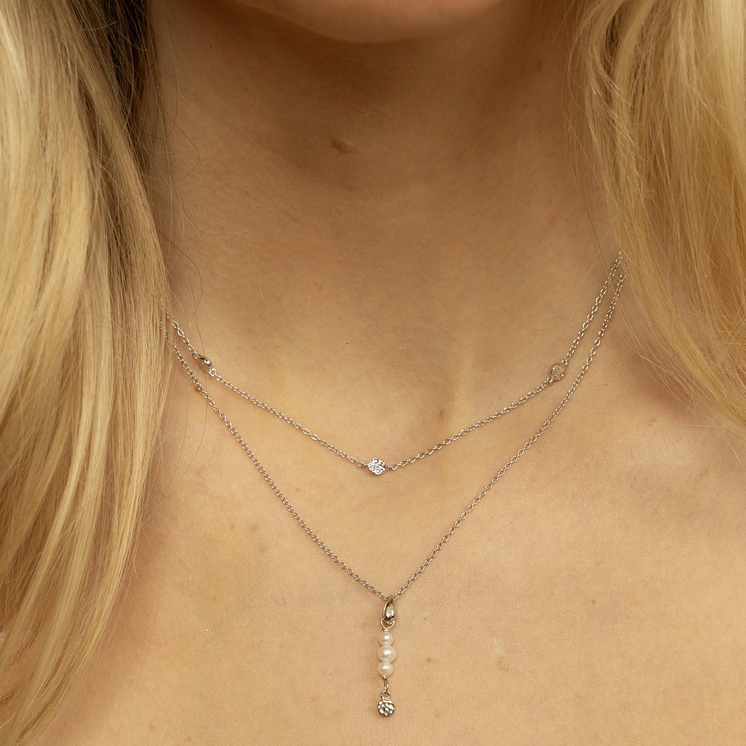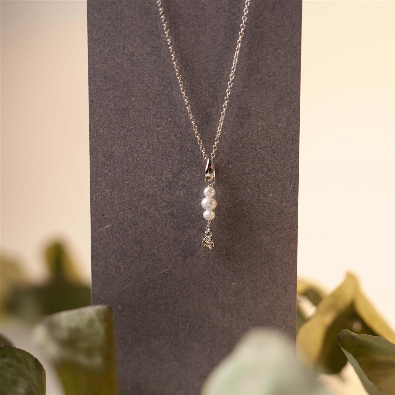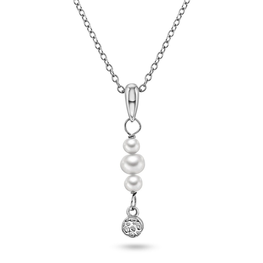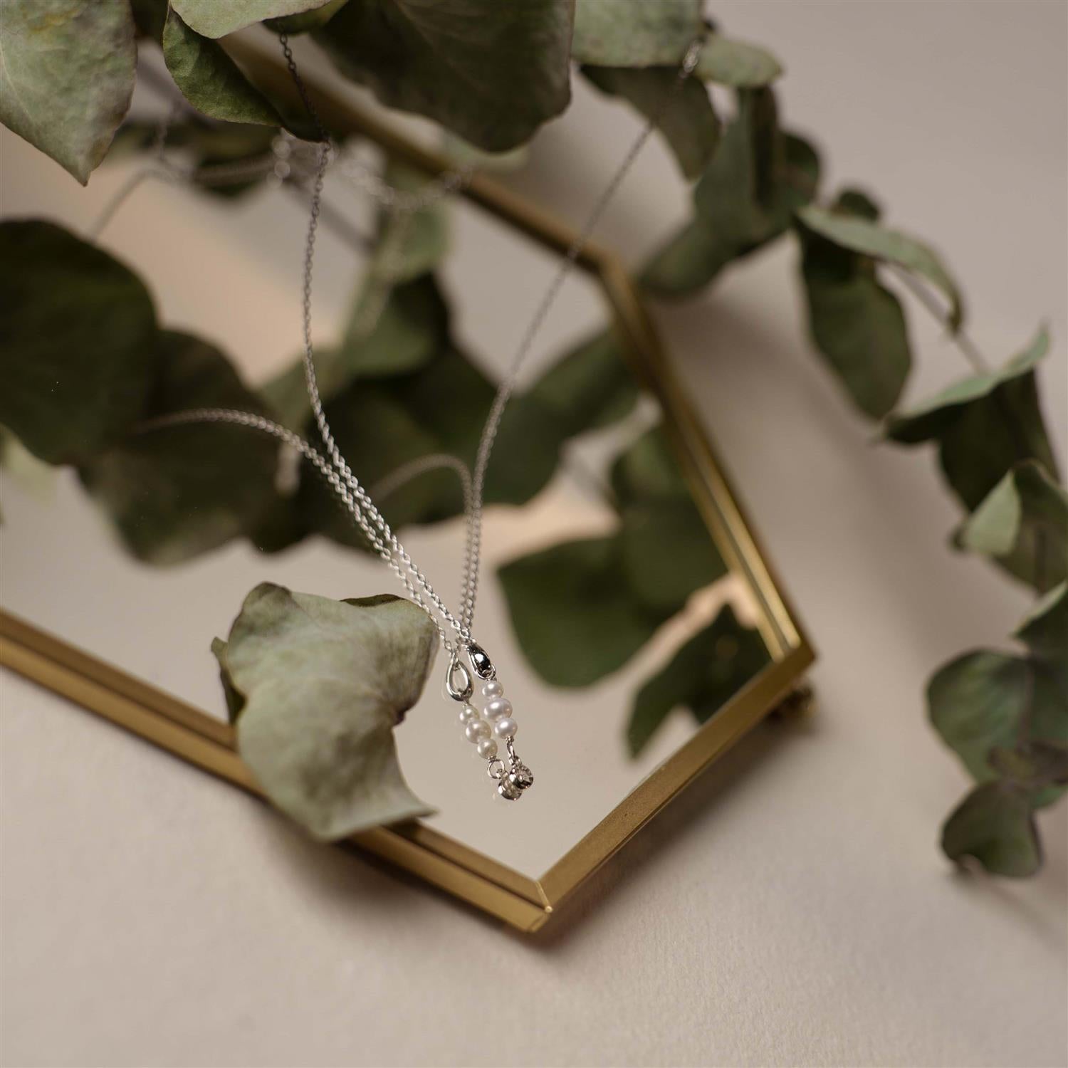 Nydelig anheng med hvite ferskvannsperler i ulike størrelser. 42 cm langt + 5 cm forlenger. Detaljer med hamret effekt. Finnes i matchende øredobber og