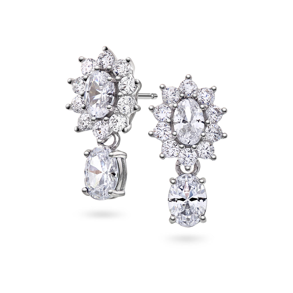 Tidløse og sofistikerte øredobber i 925 rhodinert sølv med hvit sentersten, omkranset av glitrende hvite stener. Et smykke om skiller seg ut, for den som ønsker det lille ekstra. Kommer også med blå sentersten.