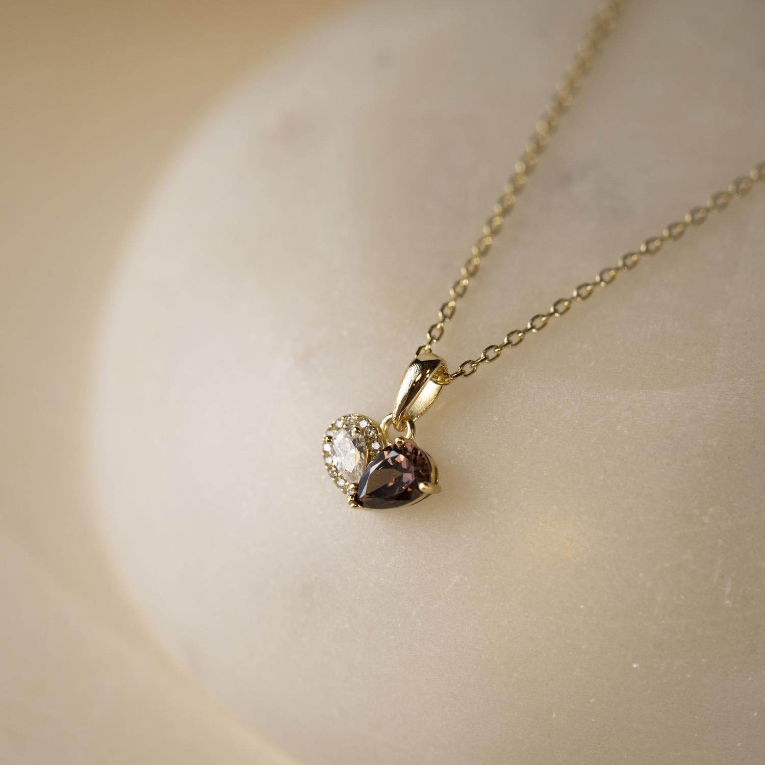 Et delikat hjerte i 925 forgylt sølv, satt sammen av to stener. To deler som møtes i ett symbol - for vennskap, kjærlighet eller balanse. Fås i smykke, armbånd og øreringer, og i flere farger.