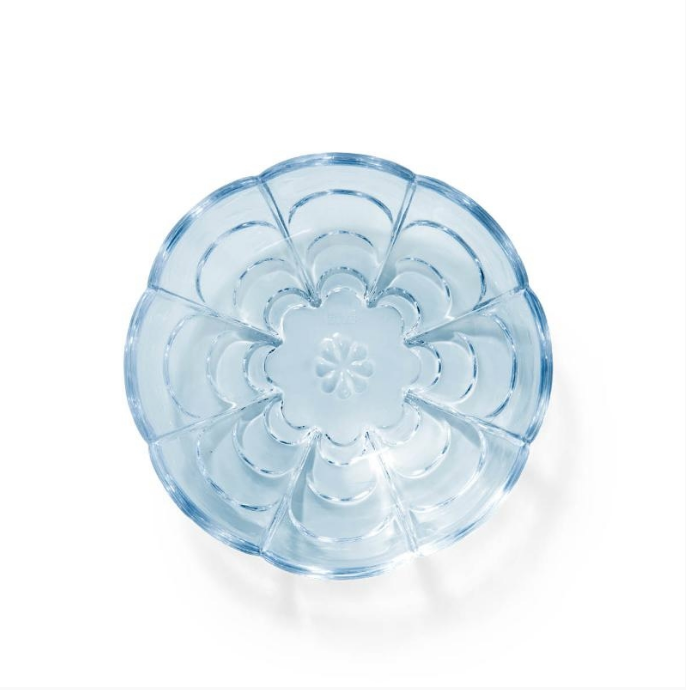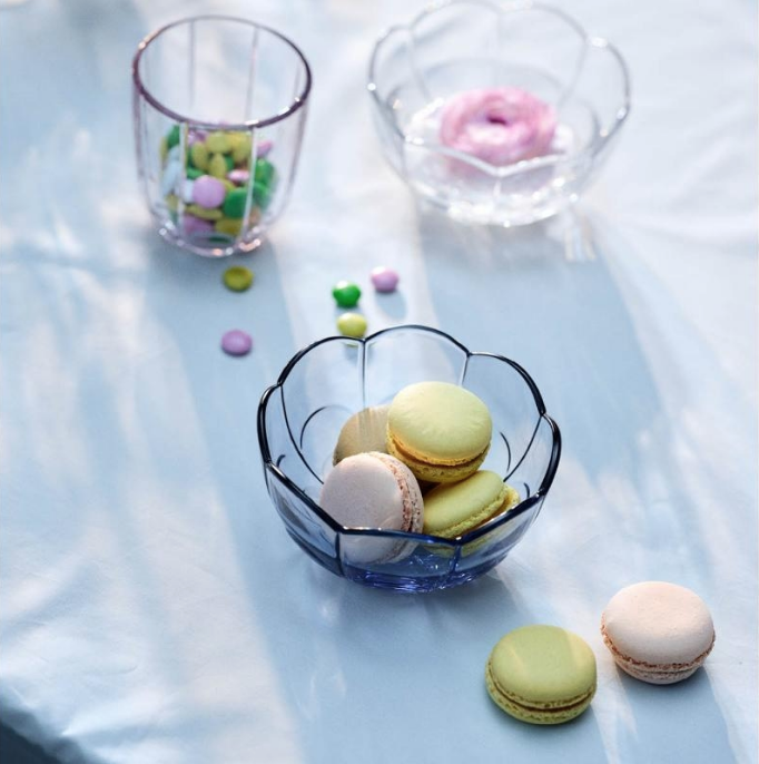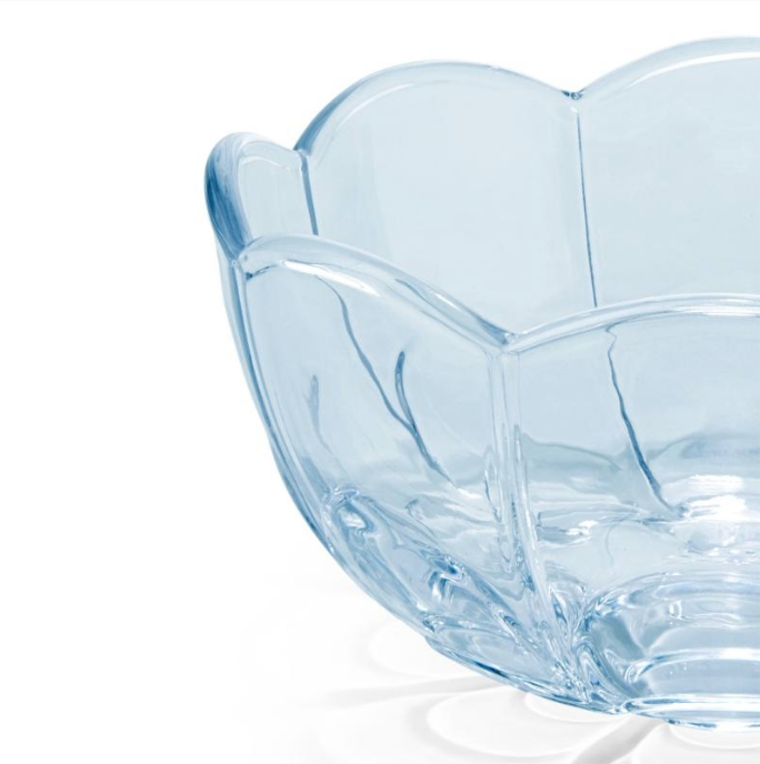 Holmegaards Lily-serie er inspirert av de forskjellige stadiene i vannliljens blomstring og har det samme lette og poetiske uttrykket som den vakre blomsten selv. Skålen i Blue Iris har en diameter på 13 cm og er flott å spise av eller perfekt til å servere sukkebiter, syltetøy, karameller eller noe helt annet. Blomstermønsteret stikker ut som relieff i det støpte glasset, som er både gjennomsiktig og taktilt. Linjene i designen er enkle, myke og organiske, men på en strømlinjeformet og stilfull måte som skaper en fin balanse mellom et romantisk og moderne uttrykk.