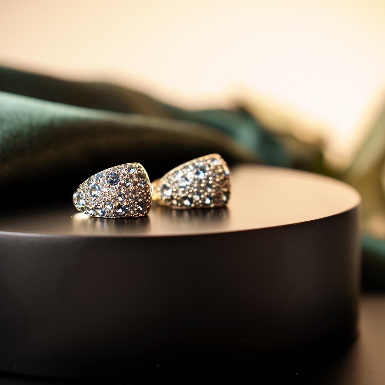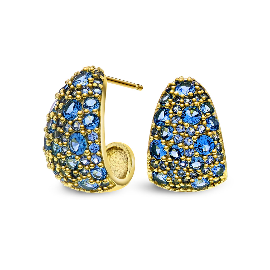 Øredobber i forgylt sølv med blå zirkonia fra Nora Mørks kolleksjon med Gulldia.
