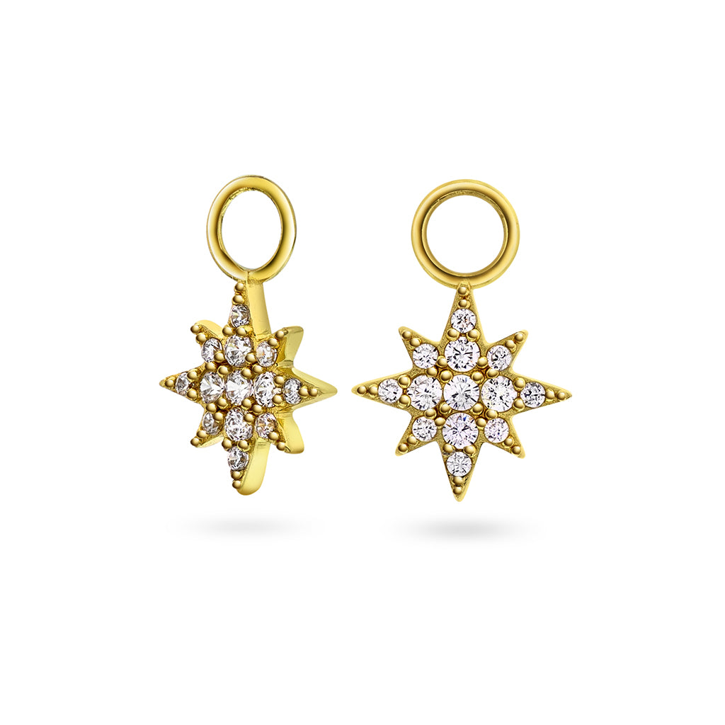 Star charms i forgylt sølv med hvite zirkonia fra Nora Mørks kolleksjon med Gulldia. Fantastiske charms til å pynte opp dine øreringer.