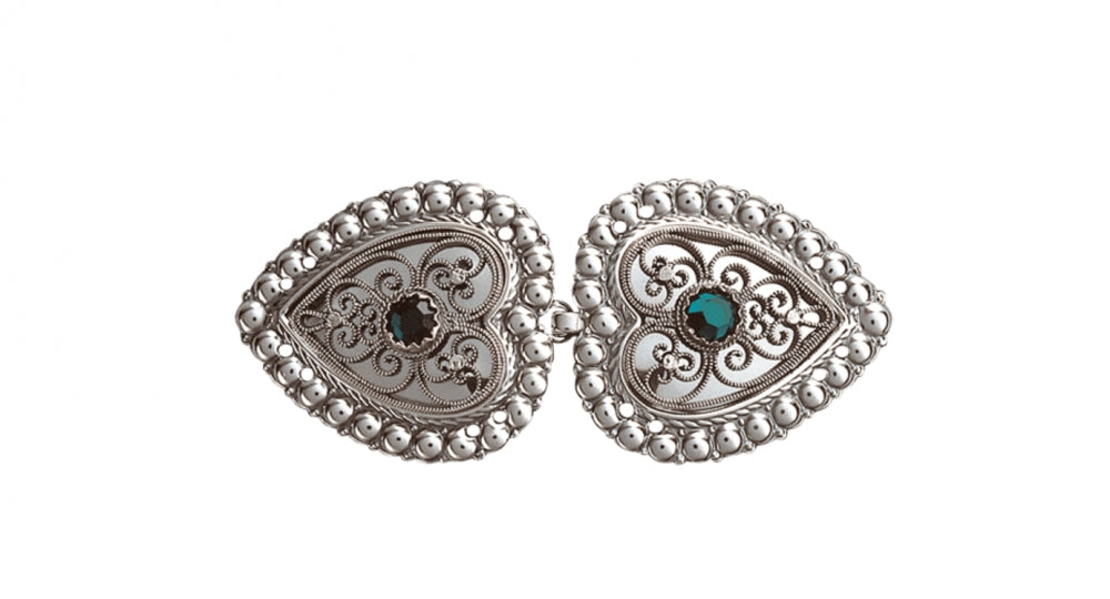 Nydelig hjerteformet capespenne i oksidert sølv, dekorert med kruse og filigran, og en nydelig grønn stein. Blir mellom annet brukt til Sogn, Nordhordaland og Vest-Oppland. Størrelse: 70x29 mm.