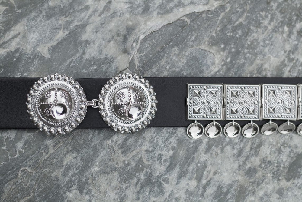 Svart skinnlist til bunadsbelte. Blir levert med hull til støler og spenner. Avstanden mellom hvert hull er 3cm.