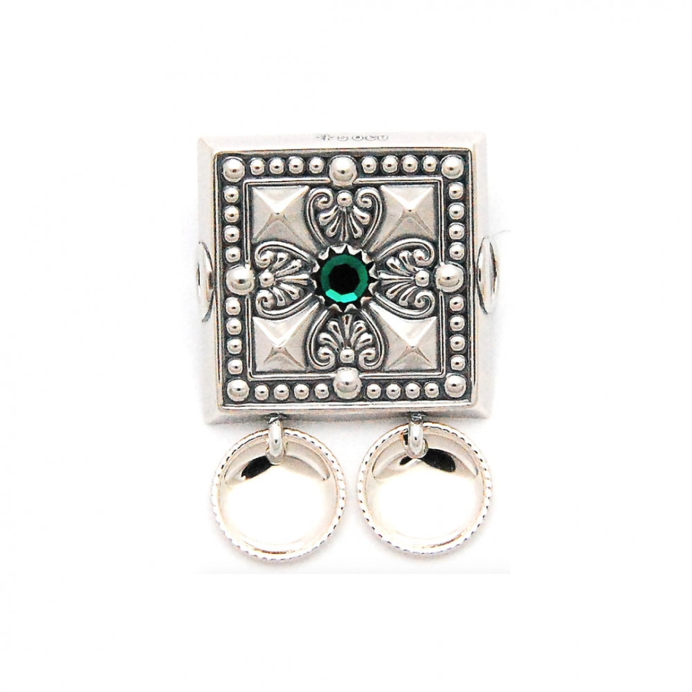 Beltestøl med trådkantløv i oksidert sølv, utsmykket med grønn glass-sten i midten. Du monterer de på skinnlist eller stoffbelte med monteringsringene på baksiden. Størrelse: 30x30mm.