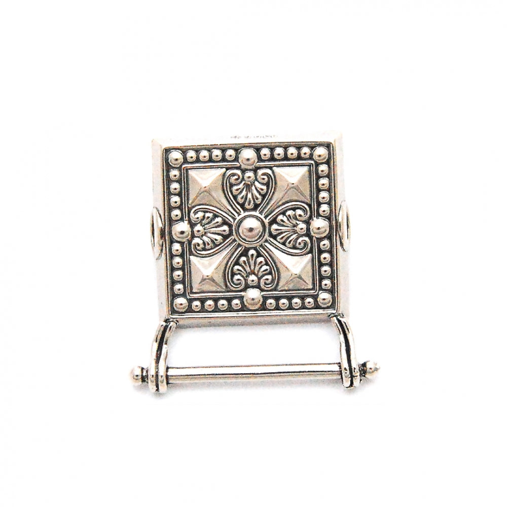 Veskestøl i oksidert sølv. Motivet med diagonalkorset finner man igjen i mye av bunadsølvet rundt om i landet, og denne typen beltestøler har gjennom generasjoner vært den mest brukte. Størrelse: 30x30mm. Hempe: 26mm.