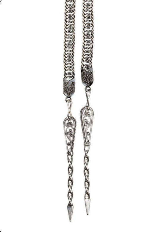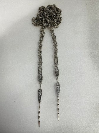 Et nydelig breikjede i oksidert sølv med vridde filigranspyd. Kjedet måler til 120cm og hvert spyd til 8cm.