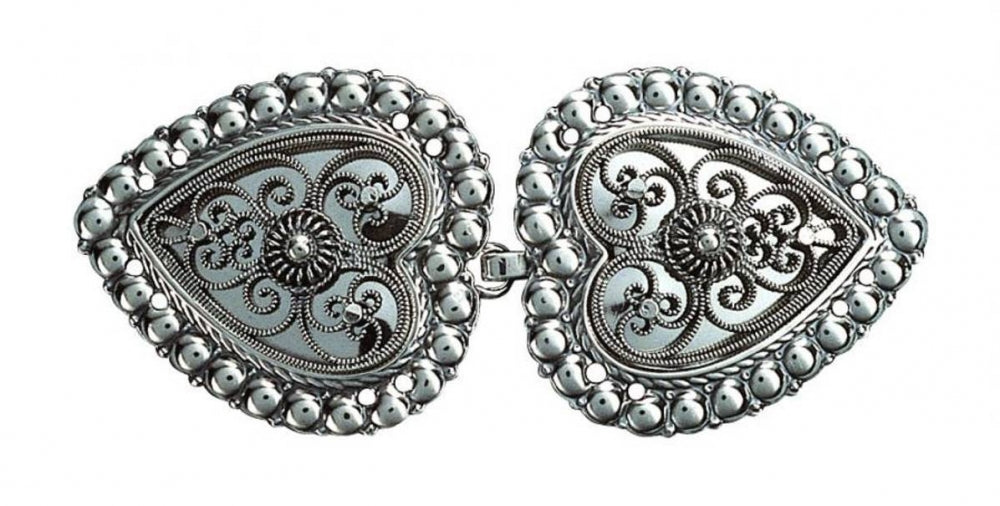 Hjerteformede spenner til fløyelsesbelte med hull til å sy, i 830 oksidert sølv. Størrelse: 95x40mm.