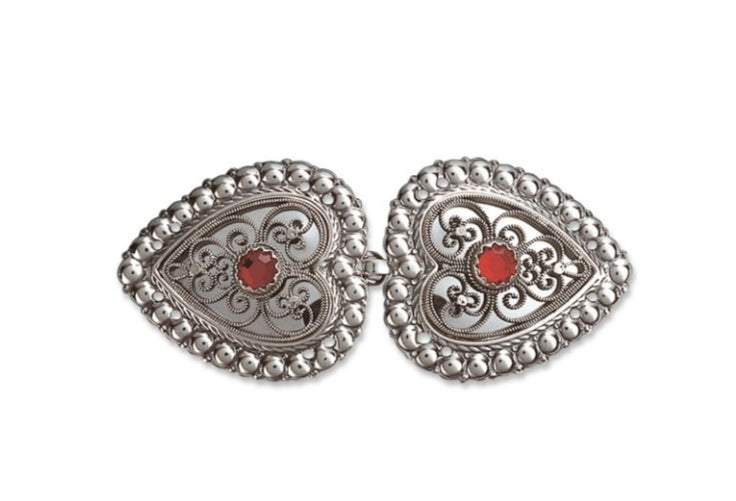 Blanke, hjerteformede beltespenner i oksidert sølv med rød stein. Den er omkranset med nydelig perlekant og filigrandekor med kruse i midten. Blir montert på skinnlist. Størrelse: 95x40mm.