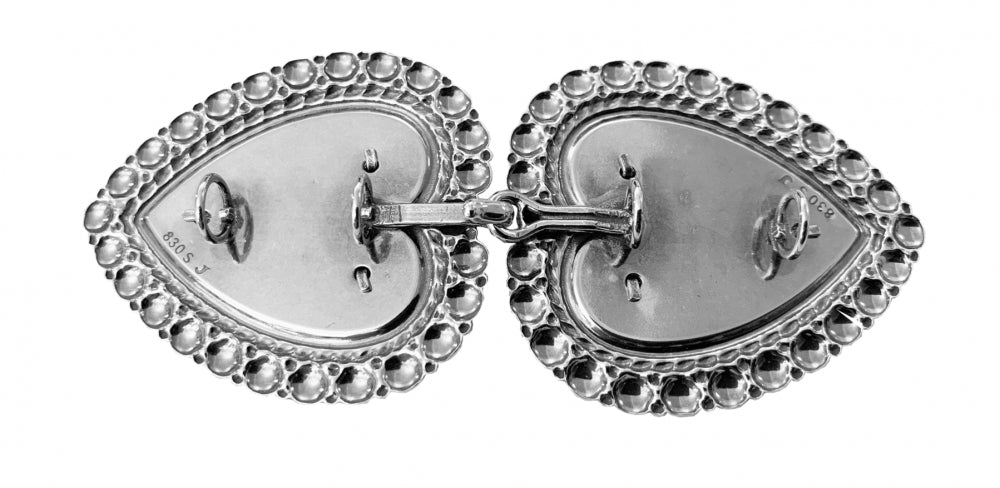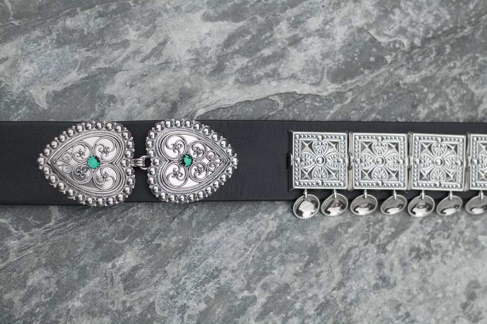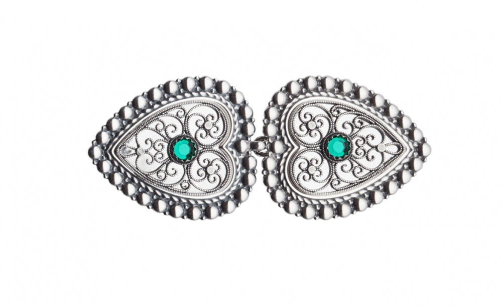 Blanke, hjerteformede beltespenner i oksidert sølv med grønn stein. Den er omkranset med nydelig perlekant og filigrandekor med kruse i midten. Blir montert på skinnlist. Størrelse: 95x40mm.