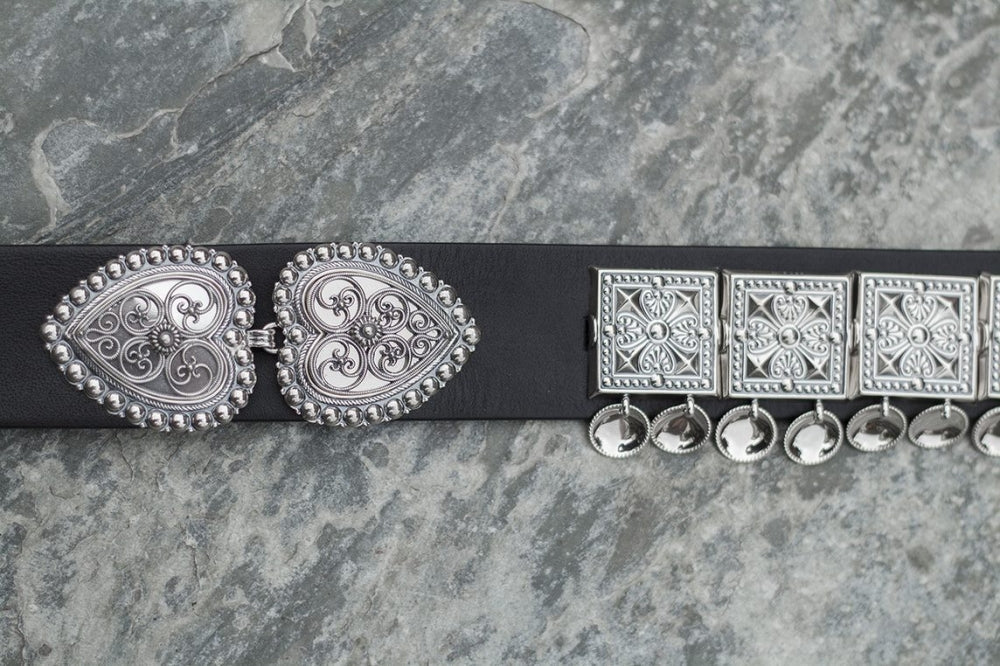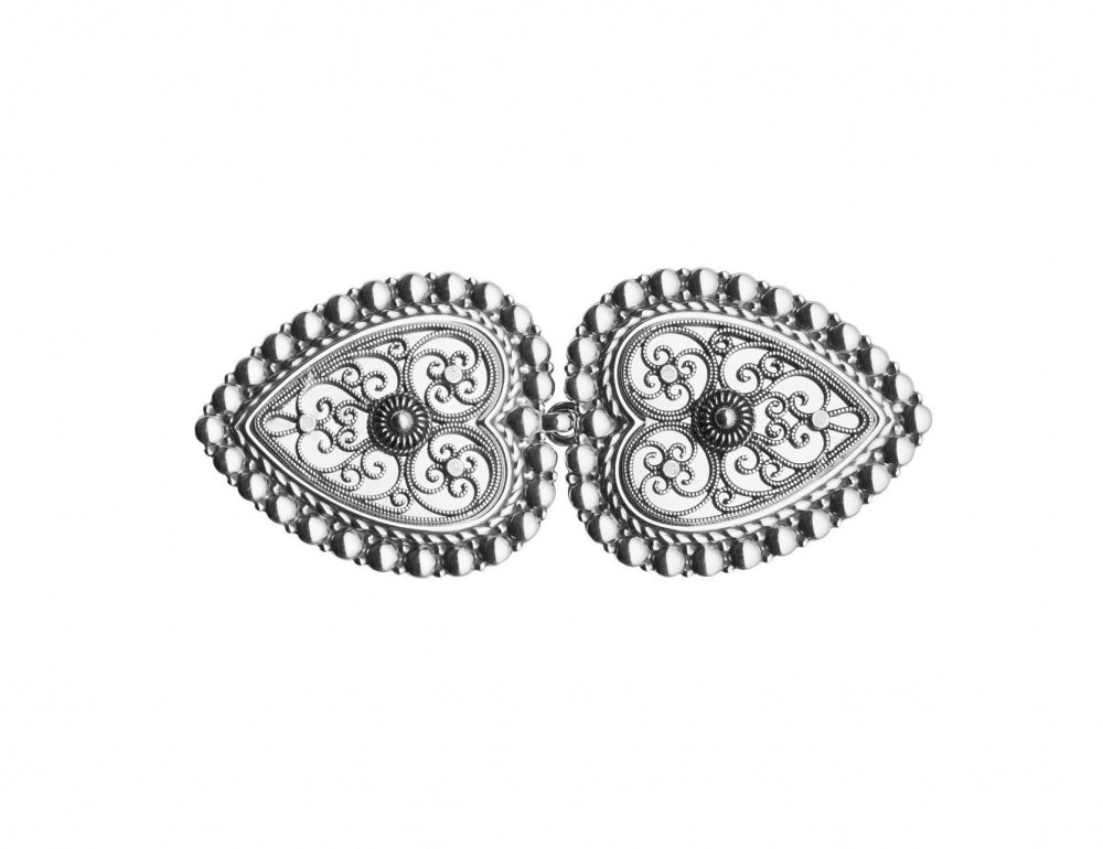 Blanke, hjerteformede beltespenner i oksidert sølv. Den er omkranset med nydelig perlekant og filigrandekor med kruse i midten. Blir montert på skinnlist. Størrelse: 95x40mm.