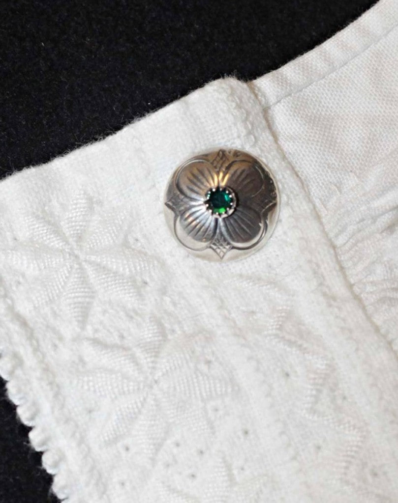 Tradisjonsrike mansjettknapper i oksidert sølv med grønn stein og firkløvermotiv - selve symbolet for hell og lykke. Disse mansjettknappene blir mellom annet brukt i Sogn, Sunnfjord og Nordfjord. Størrelse: 16mm.