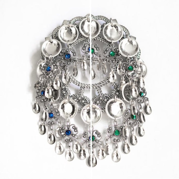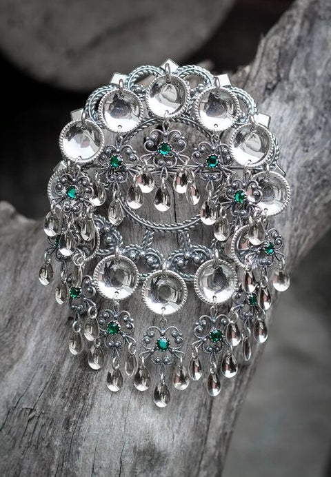 Nydelig stor brystsølje med fargede steiner; velg mellom grønn eller blå. Søljen er i 830 oksidert sølv og inkluderer 12 løv med heng. Størrelse: Ø72mm (ca 110mm lang med heng).