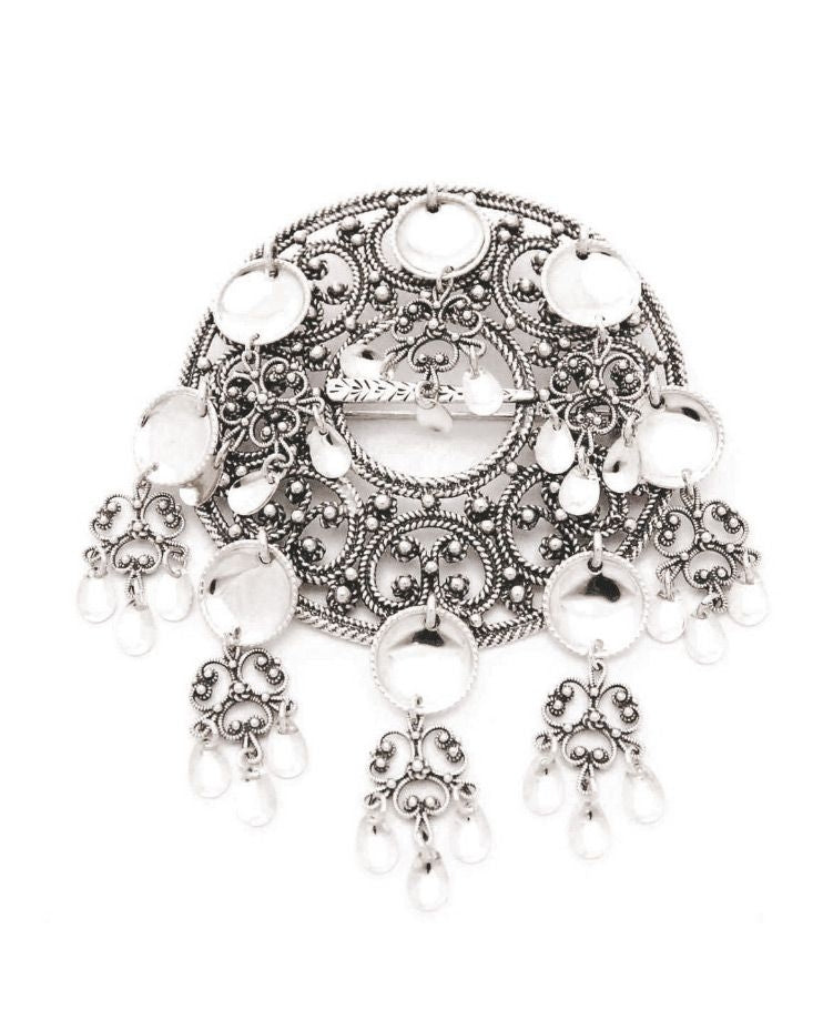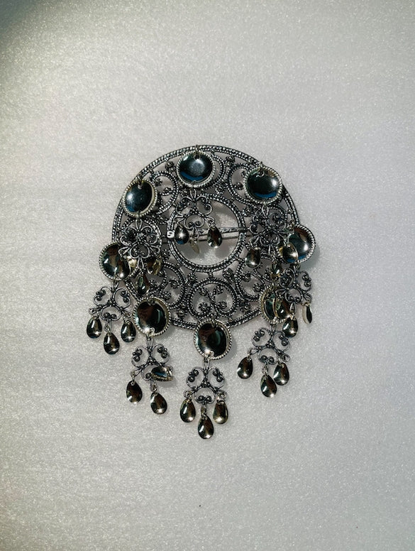 Filigranbunn i oksidert sølv med åtte heng. Hvert heng består av et blankt trådkantløv og en filigranblomst pyntet med tre blanke dryppløv. Diameter på stammen er 7 cm. Høyde inkludert heng er 10,5cm.