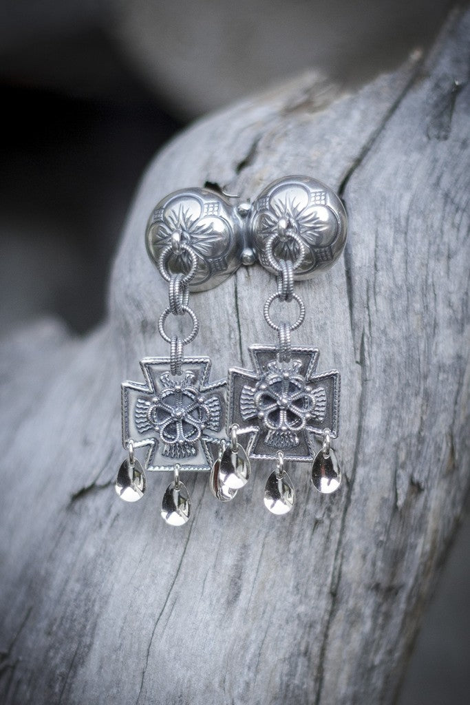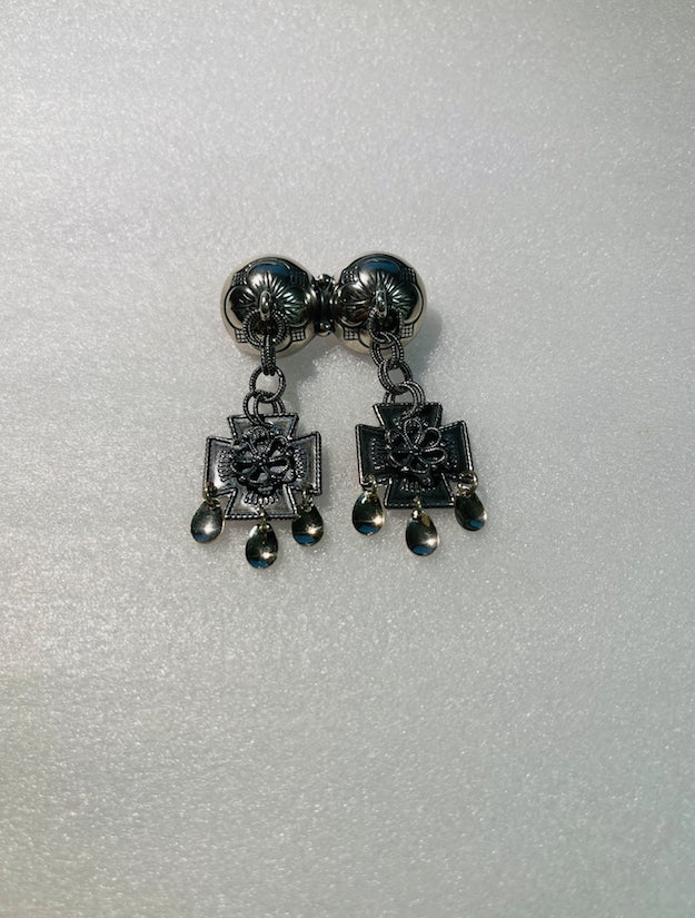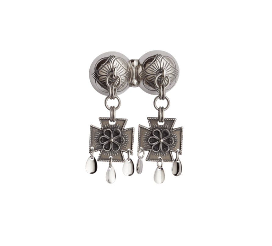 Dobbel halssølje i oksidert sølv med rosettdekor og korsløvheng, som blir brukt både til dame- og herrebunad.