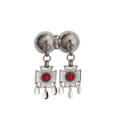Halssølje i oksidert sølv med korsløv og blanke dråpeløv. Dekorativ rød stein midt på korsløvene som matcher bunaden. Størrelse: 37x55 mm.