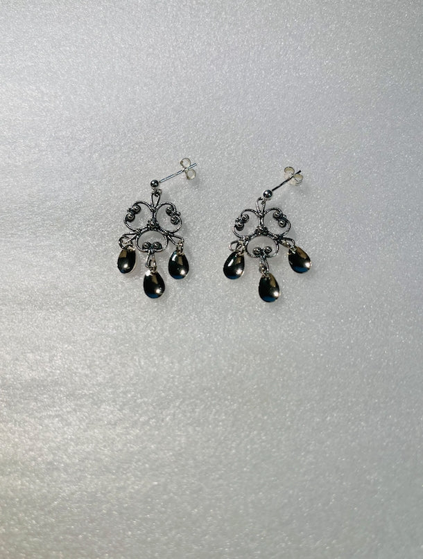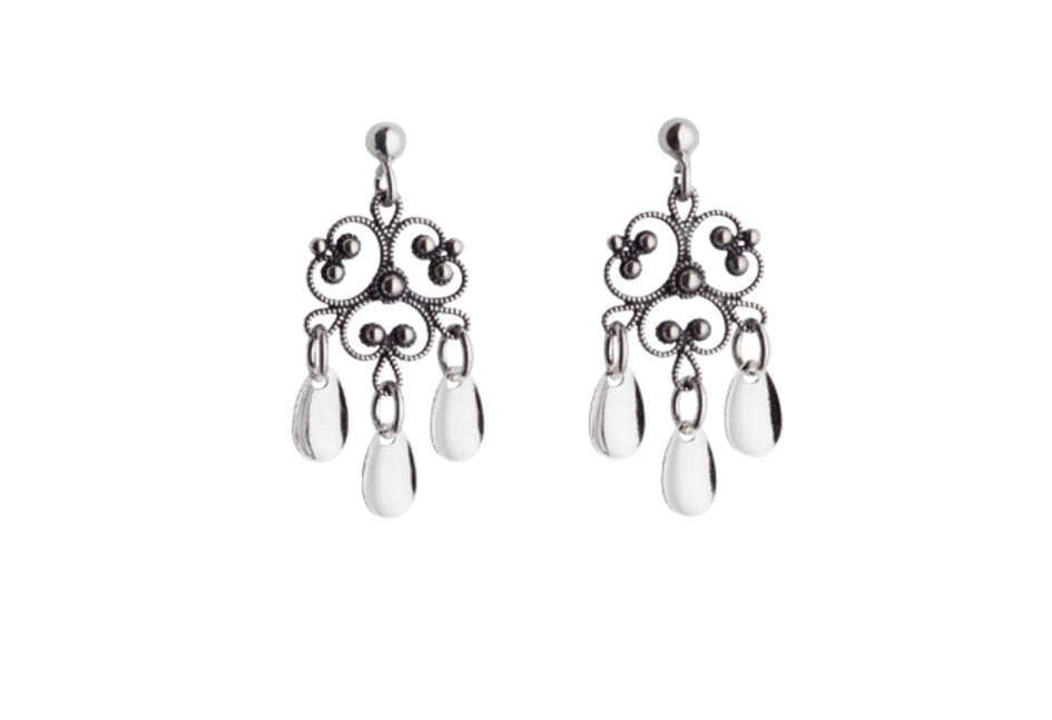 Nydelig, blomsterformet ørepynt i oksidert sølv med tradisjonell filigrandekor og små, blanke dryppløv. Flott tilbehør til bunaden. Passer til alle bunader med oksidert bunadsølv.
