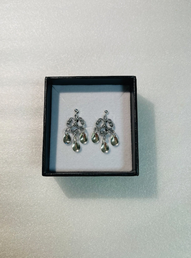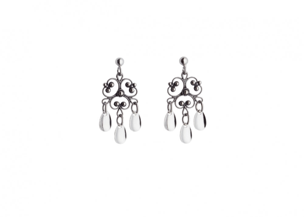 Nydelig, blomsterformet ørepynt i oksidert sølv med tradisjonell filigrandekor og små, blanke dryppløv. Flott tilbehør til bunaden. Passer til alle bunader med oksidert bunadsølv.