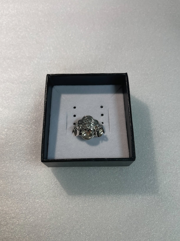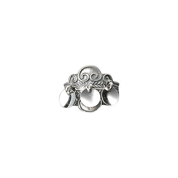 Bunadsring i oksidert sølv med tre, blanke løvheng og tradisjonsrik filigrandekor. Passer til bunader med oksidert bunadsølv, og kan reguleres slik at den passer alle størrelser.