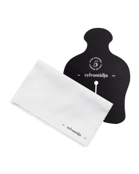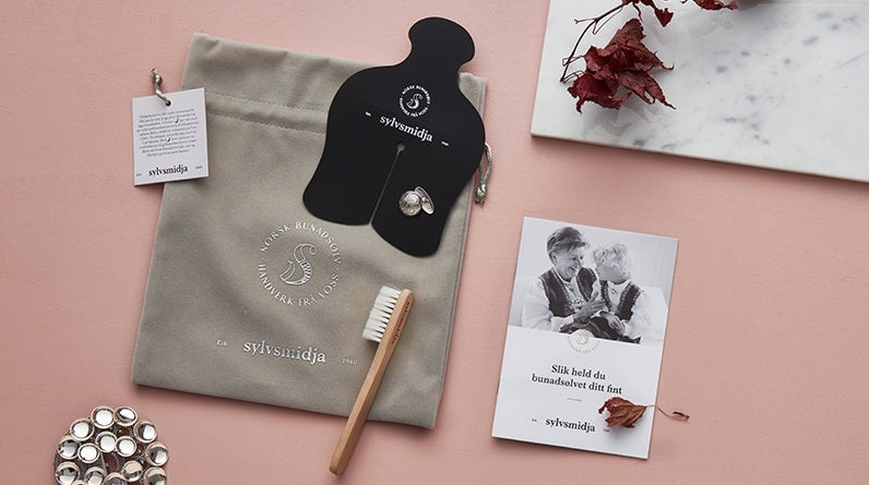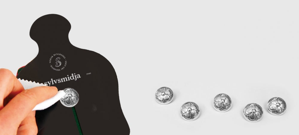På brettet er det en slisse hvor man kan sette inn knappen. Da kan man pusse sølvet imens det er på bunaden uten å sverte på stoffet. Pussekluten er også fin til å pusse overflatene på det andre bunadsølvet.