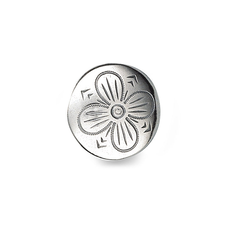 Støpt tradisjonell bunadsknapp i oksidert sølv. Firkløveren – symbolet på hell og lykke pryder denne knappen.