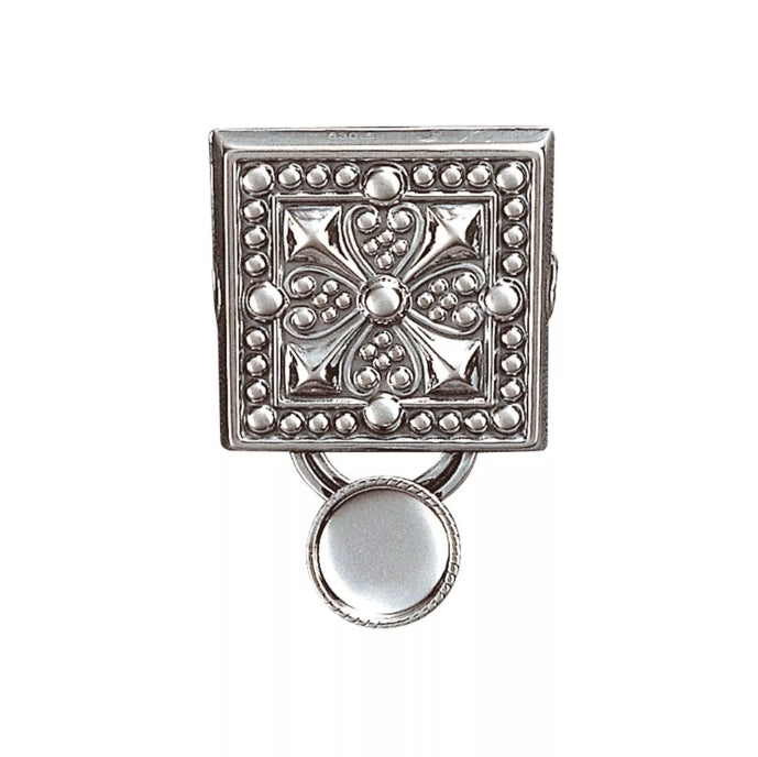Knivstøl i oksidert sølv dekorert med det tradisjonelle motivet diagonalkrysset som brukes på bunadsølv rundt omkring i landet. Kniven fester man ved å tre sliren på trådkantlauvet som fungerer som knapp.