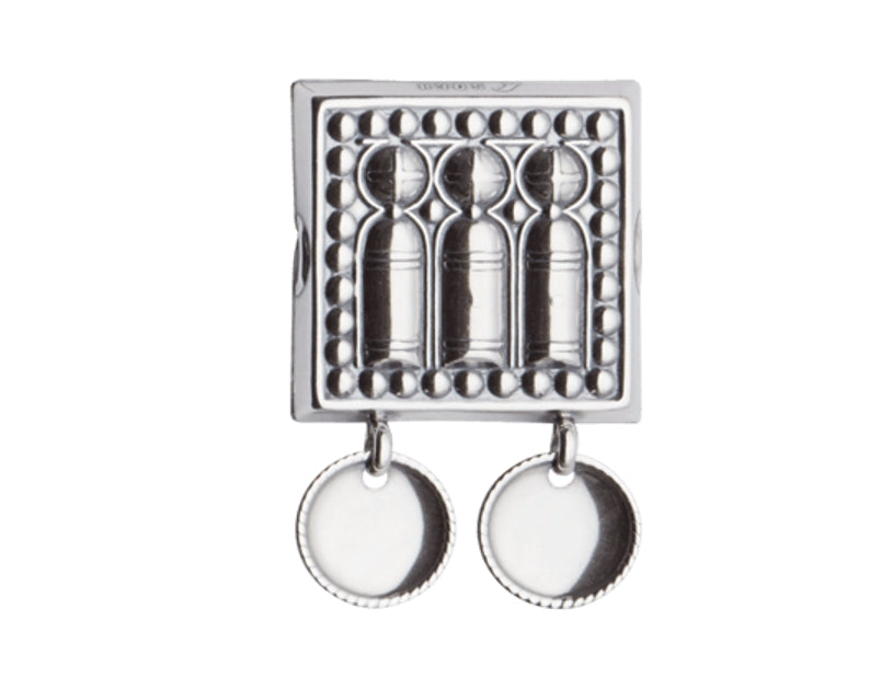 Beltestøl med motiv som skal illustrere De tre vise menn, i oksidert sølv. Du monterer de på skinnlist eller stoffbelte med monteringsringene på baksiden. Ta gjerne kontakt med oss ved hjelp av montering. Størrelse: 30x30mm.
