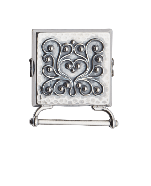 Vakker veskestøl i oksidert sølv med lang hempe og påloddet filigran. Denne veskestølen skal monteres på en sort skinnlist, mye brukt i Rogalandsområdet. Størrelse: 30x30 mm, 26 mm hempe.