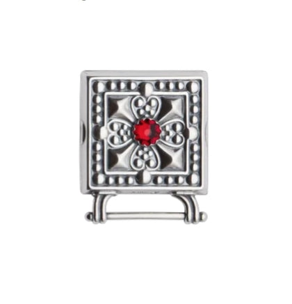Veskestøl med trådkantløv i oksidert sølv, utsmykket med rød glass-sten i midten. Du monterer de på skinnlist eller stoffbelte med monteringsringene på baksiden. Størrelse: 30x30mm. Hempe: 18 mm.