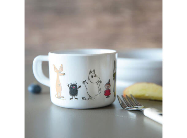 Mummikarakterene har samlet seg på en liten kopp i melamin. Rommer 2,5 dl. Godkjent for bruk av oppvaskmaskin.