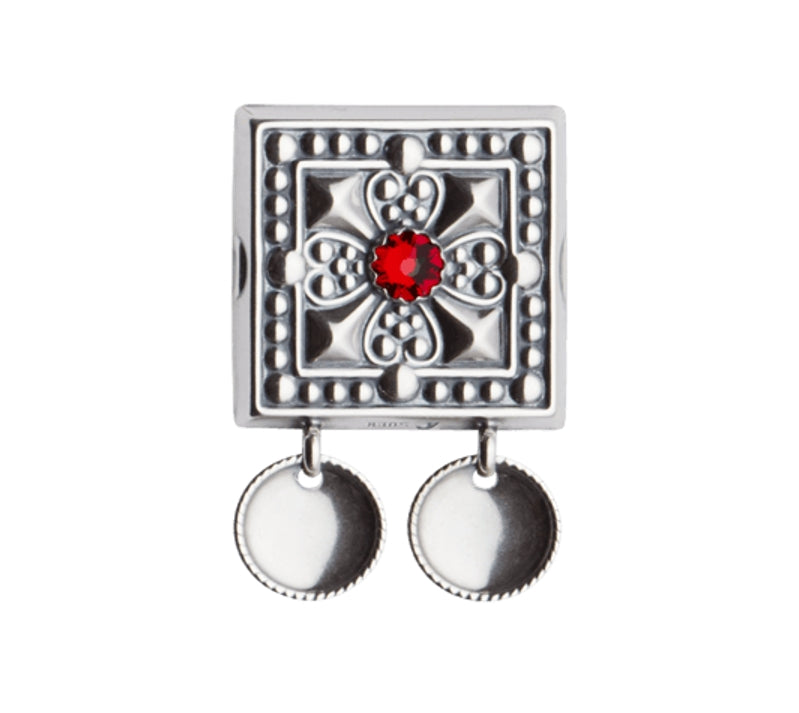Beltestøl med trådkantløv i oksidert sølv, utsmykket med rød glass-sten i midten. Du monterer de på skinnlist eller stoffbelte med monteringsringene på baksiden. Størrelse: 30x30mm.