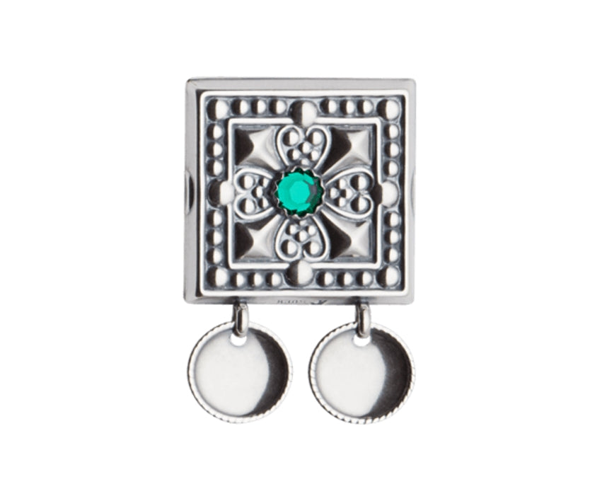Beltestøl med trådkantløv i oksidert sølv, utsmykket med grønn glass-sten i midten. Du monterer de på skinnlist eller stoffbelte med monteringsringene på baksiden. Størrelse: 30x30mm.